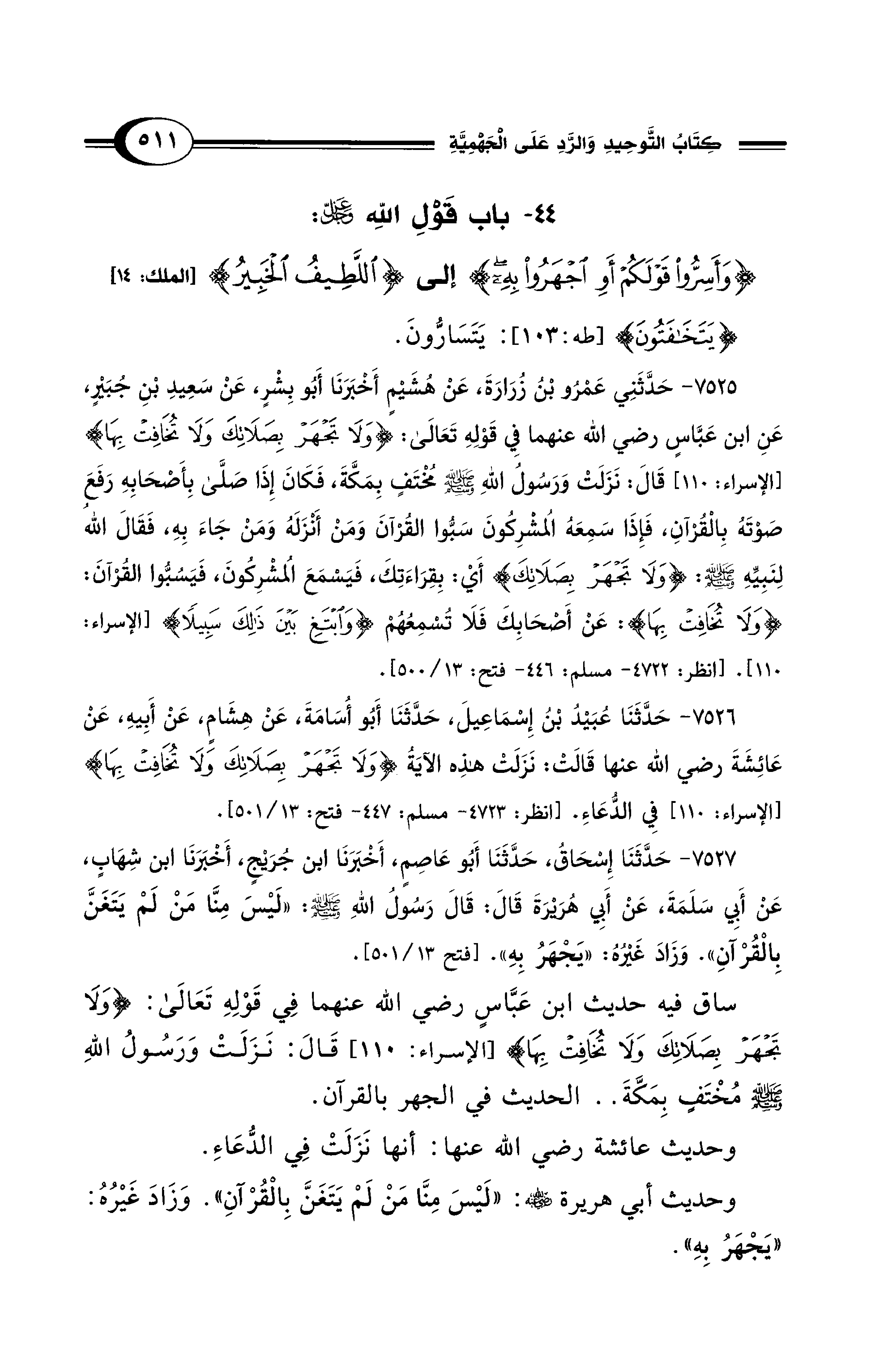 7525 - حَدَّثَنِي عَمْرُو بْنُ زُرَارَةَ، عَنْ هُشَيْمٍ أَخْبَرَنَا أَبُو بِشْرٍ، عَنْ سَعِيدِ بْنِ جُبَيْرٍ، عَنِ ابْنِ عَبَّاسٍ - رضي الله عنهما - فِي قَوْلِهِ تَعَالَى: {وَلاَ تَجْهَرْ بِصَلاَتِكَ وَلاَ تُخَافِتْ بِهَا} [الاسراء: 110] قَالَ: نَزَلَتْ وَرَسُولُ اللهِ - صلى الله عليه وسلم - مُخْتَفٍ بِمَكَّةَ، فَكَانَ إِذَا صَلَّى بِأَصْحَابِهِ رَفَعَ صَوْتَهُ بِالْقُرْآنِ، فَإِذَا سَمِعَهُ المُشْرِكُونَ سَبُّوا الْقُرْآنَ وَمَنْ أَنْزَلَهُ وَمَنْ جَاءَ بِهِ، فَقَالَ اللهُ لِنَبِيِّهِ - صلى الله عليه وسلم -: {وَلاَ تَجْهَرْ بِصَلاَتِكَ} أَيْ: بِقِرَاءَتِكَ، فَيَسْمَعَ المُشْرِكُونَ، فَيَسُبُّوا القُرْآنَ: {وَلاَ تُخَافِتْ بِهَا}: عَنْ أَصْحَابِكَ فَلاَ تُسْمِعُهُمْ {وَابْتَغِ بَيْنَ ذَلِكَ سَبِيلاً} [الإسراء: 110]. [انظر: 4722 - مسلم: 446 - فتح: 13/ 500].