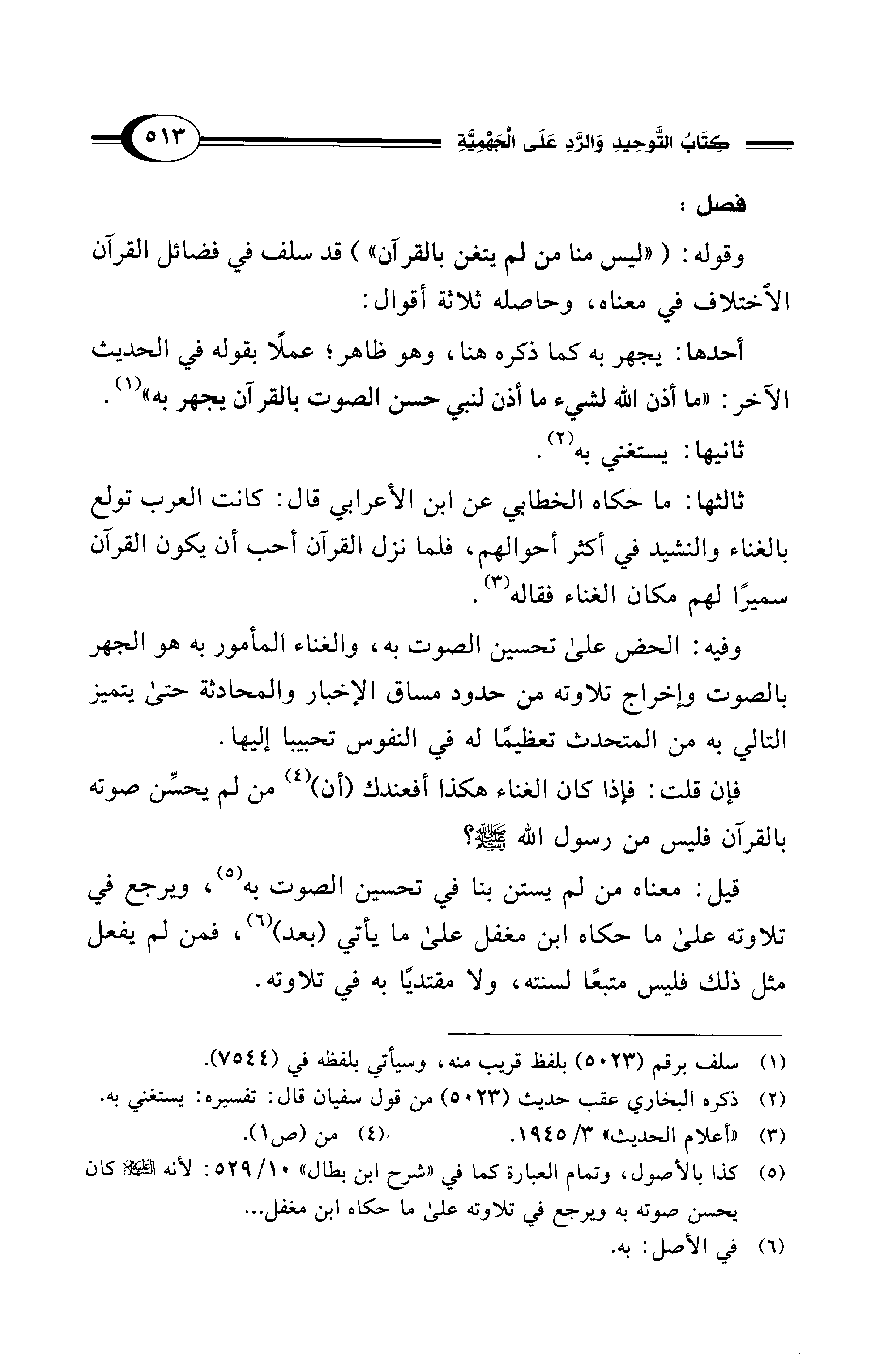 وقوله: ("ليس منا من لم يتغن بالقرآن") قد سلف في فضائل القرآن الاختلاف في معناه، وحاصله ثلاثة أقوال: