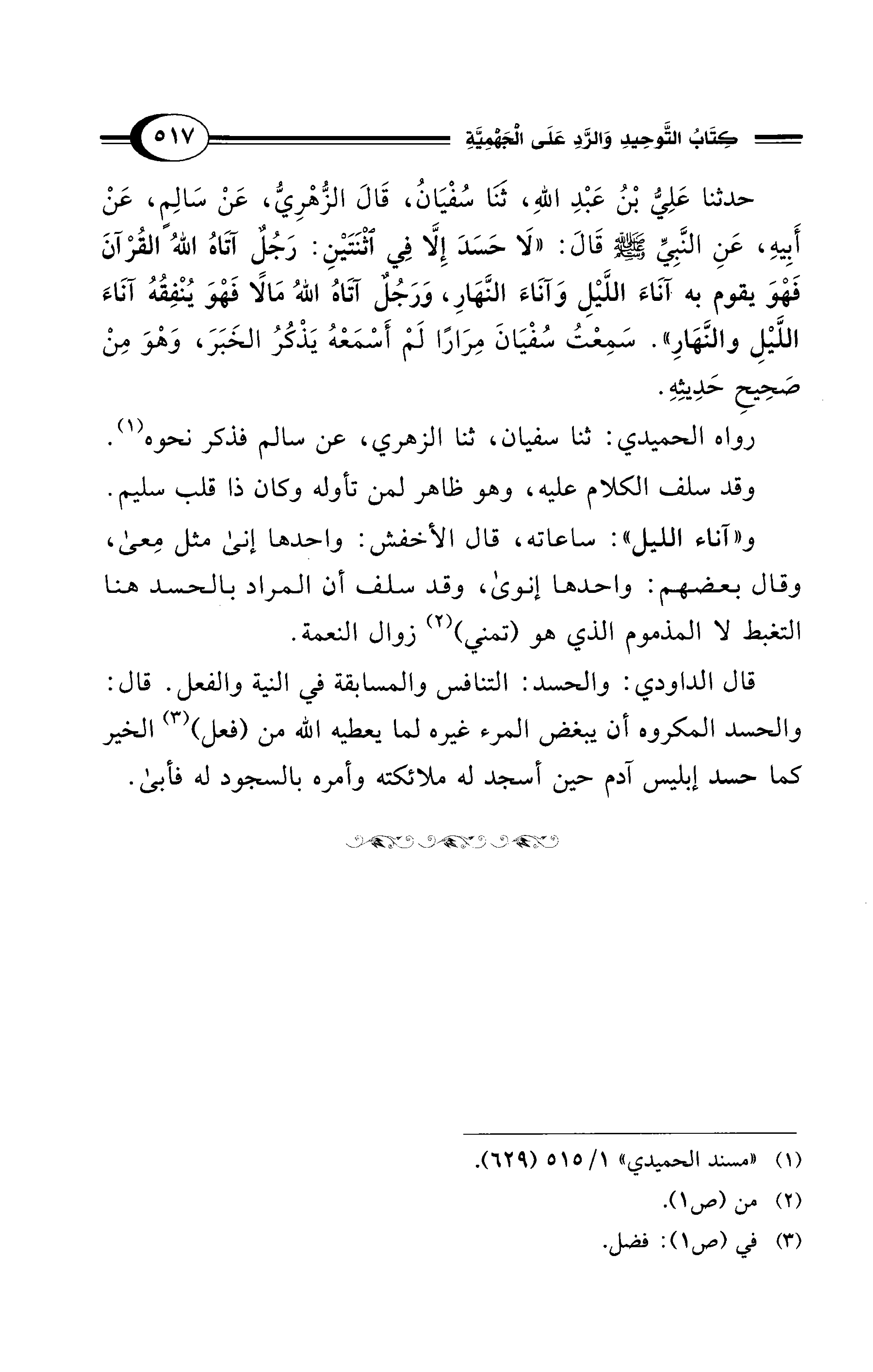 حدثنا عَلِيُّ بْنُ عَبْدِ اللهِ، ثَنَا سُفْيَانُ، قَالَ الزُّهْرِيِّ، عَنْ سَالِم، عَنْ أَبِيهِ، عَنِ النَّبِيِّ - صلى الله عليه وسلم - قَالَ: "لَا حَسَدَ إِلَّا فِي اثْنَتَيْنِ: رَجُل آتَاهُ اللهُ القُرْآنَ فَهْوَ يقوم به آنَاءَ اللَيْلِ وآنَاءَ النَّهَارِ، وَرَجُلٌ آتَاهُ اللهُ مَالًا فَهْوَ يُنْفِقُهُ آنَاءَ اللَّيْلِ والنَّهَارِ". سَمِعْتُ سُفْيَانَ مِرَارًا لَمْ أَسْمَعْهُ يَذْكُرُ الخَبَرَ، وَهْوَ مِنْ صَحِيحِ حَدِيثِهِ.