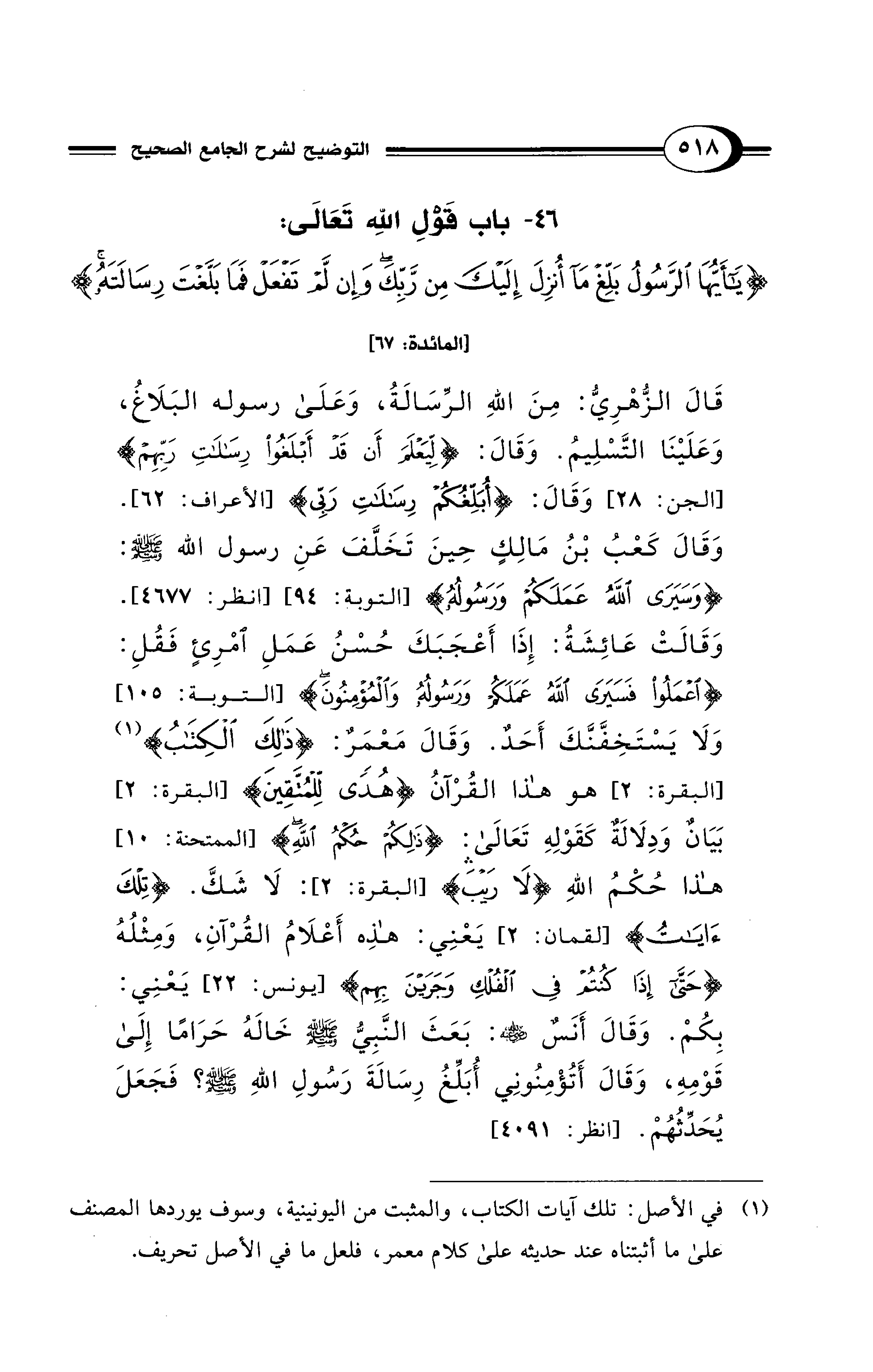 46 - باب قَوْلِ اللهِ تَعَالَى: {يَا أَيُّهَا الرَّسُولُ بَلِّغْ مَا أُنْزِلَ إِلَيْكَ مِنْ رَبِّكَ وَإِنْ لَمْ تَفْعَلْ فَمَا بَلَّغْتَ رِسَالاَتِهِ} [المائدة: 67]
