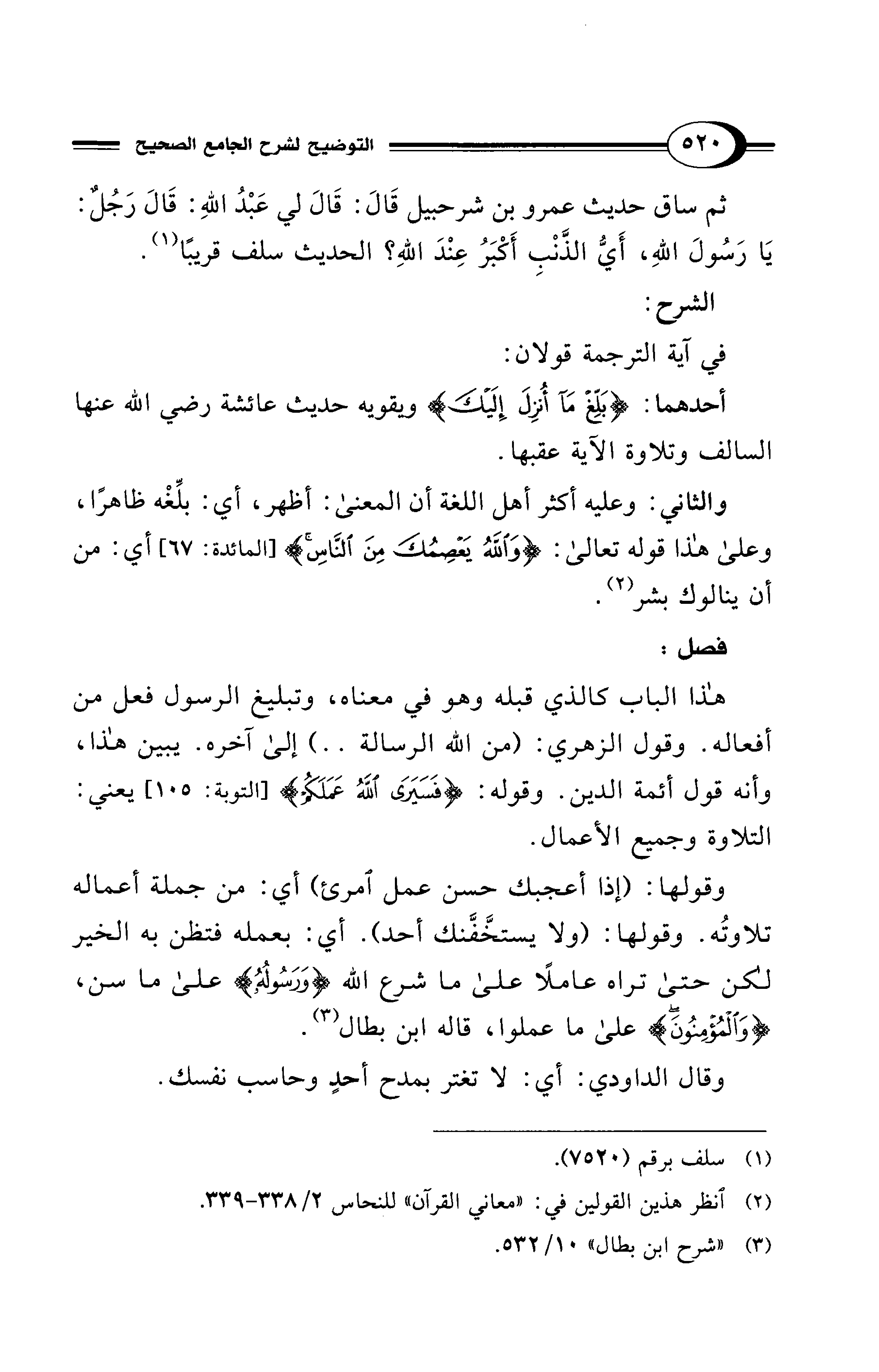 وقولها: (إذا أعجبك حسن عمل امرئ) أي: من جملة أعماله تلاوتُه. وقولها: (ولا يستخَّفَّنك أحد). أي: بعمله فتظن به الخير لكن حتى تراه عاملًا على ما شرع الله {وَرَسُولُهُ} على ما سن، {وَالْمُؤْمِنُونَ} على ما عملوا، قاله ابن بطال (¬3).