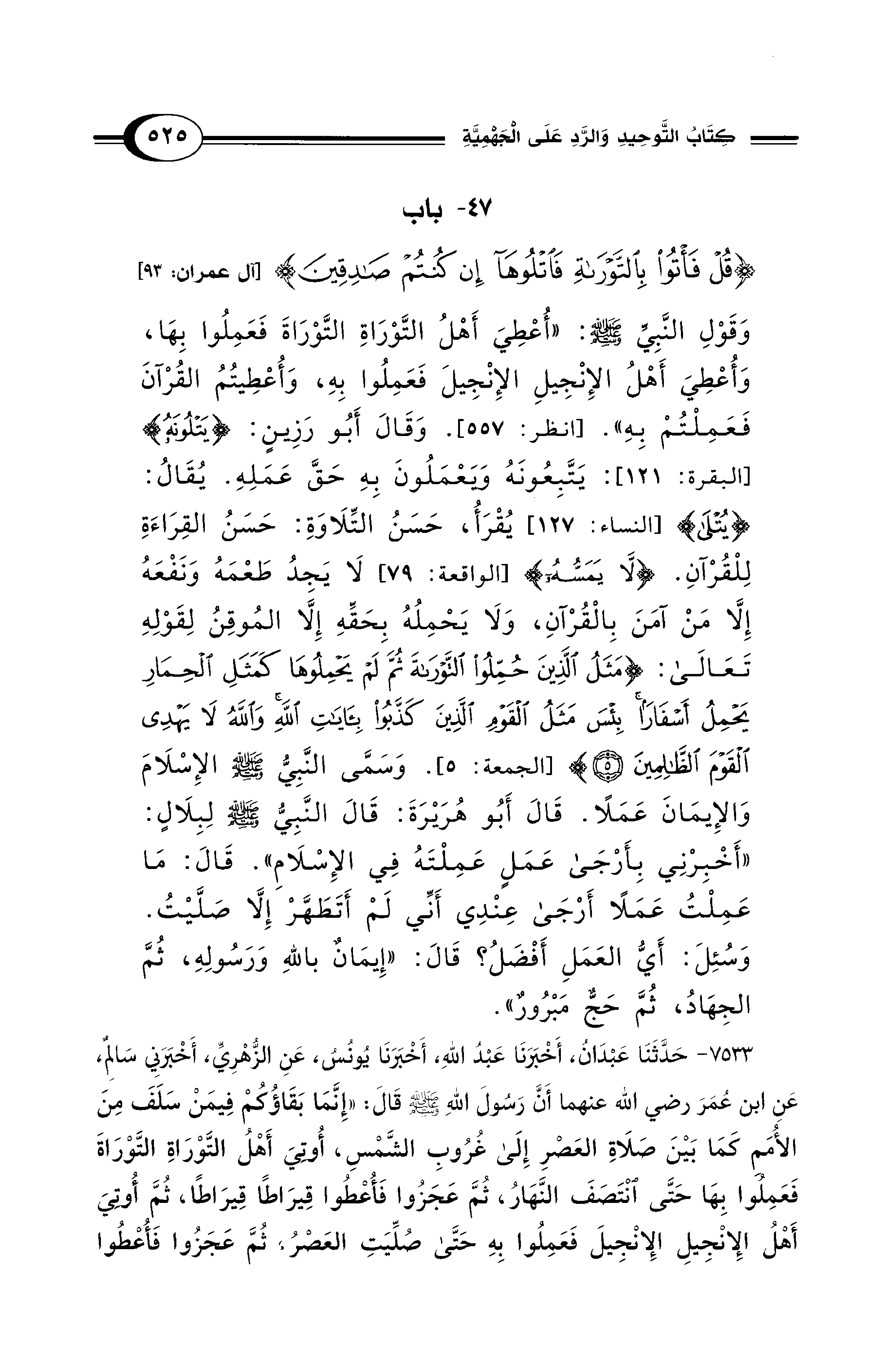 وَقَوْلِ النَّبِيِّ - صلى الله عليه وسلم -: «أُعْطِيَ أَهْلُ التَّوْرَاةِ التَّوْرَاةَ فَعَمِلُوا بِهَا، وَأُعْطِىَ أَهْلُ الإِنْجِيلِ الإِنْجِيلَ فَعَمِلُوا بِهِ، وَأُعْطِيتُمُ القُرْآنَ فَعَمِلْتُمْ بِهِ». [انظر: 557].وَقَالَ أَبُو رَزِينٍ: {يَتْلُونَهُ} [البقرة:121]:يَتَّبِعُونَهُ وَيَعْمَلُونَ بِهِ حَقَّ عَمَلِهِ. يُقَالُ: {يُتْلَى} [النساء: 127] يُقْرَأُ، حَسَنُ التِّلاَوَةِ: حَسَنُ القِرَاءَةِ لِلْقُرْآنِ. {لاَ يَمَسُّهُ} [الواقعة: 79] لاَ يَجِدُ طَعْمَهُ وَنَفْعَهُ إِلاَّ مَنْ آمَنَ بِالْقُرْآنِ، وَلاَ يَحْمِلُهُ بِحَقِّهِ إِلاَّ المُوقِنُ لِقَوْلِهِ تَعَالَى: {مَثَلُ الَّذِينَ حُمِّلُوا التَّوْرَاةَ ثُمَّ لَمْ يَحْمِلُوهَا كَمَثَلِ الْحِمَارِ يَحْمِلُ أَسْفَارًا بِئْسَ مَثَلُ الْقَوْمِ الَّذِينَ كَذَّبُوا بِآيَاتِ اللهِ وَاللهُ لاَ يَهْدِي الْقَوْمَ الظَّالِمِينَ (5)} [الجمعة: 5]. وَسَمَّى النَّبِيُّ - صلى الله عليه وسلم - الإِسْلاَمَ وَالإِيمَانَ عَمَلاً. قَالَ أَبُو هُرَيْرَةَ: قَالَ النَّبِيُّ - صلى الله عليه وسلم - لِبِلاَلٍ: «أَخْبِرْنِي بِأَرْجَى عَمَلٍ عَمِلْتَهُ فِي الإِسْلاَمِ». قَالَ: مَا عَمِلْتُ عَمَلاً أَرْجَى عِنْدِي أَنِّي لَمْ أَتَطَهَّرْ إِلاَّ صَلَّيْتُ. وَسُئِلَ: أَيُّ العَمَلِ أَفْضَلُ؟ قَالَ: «إِيمَانٌ بِاللهِ وَرَسُولِهِ، ثُمَّ الجِهَادُ، ثُمَّ حَجٌّ مَبْرُورٌ».