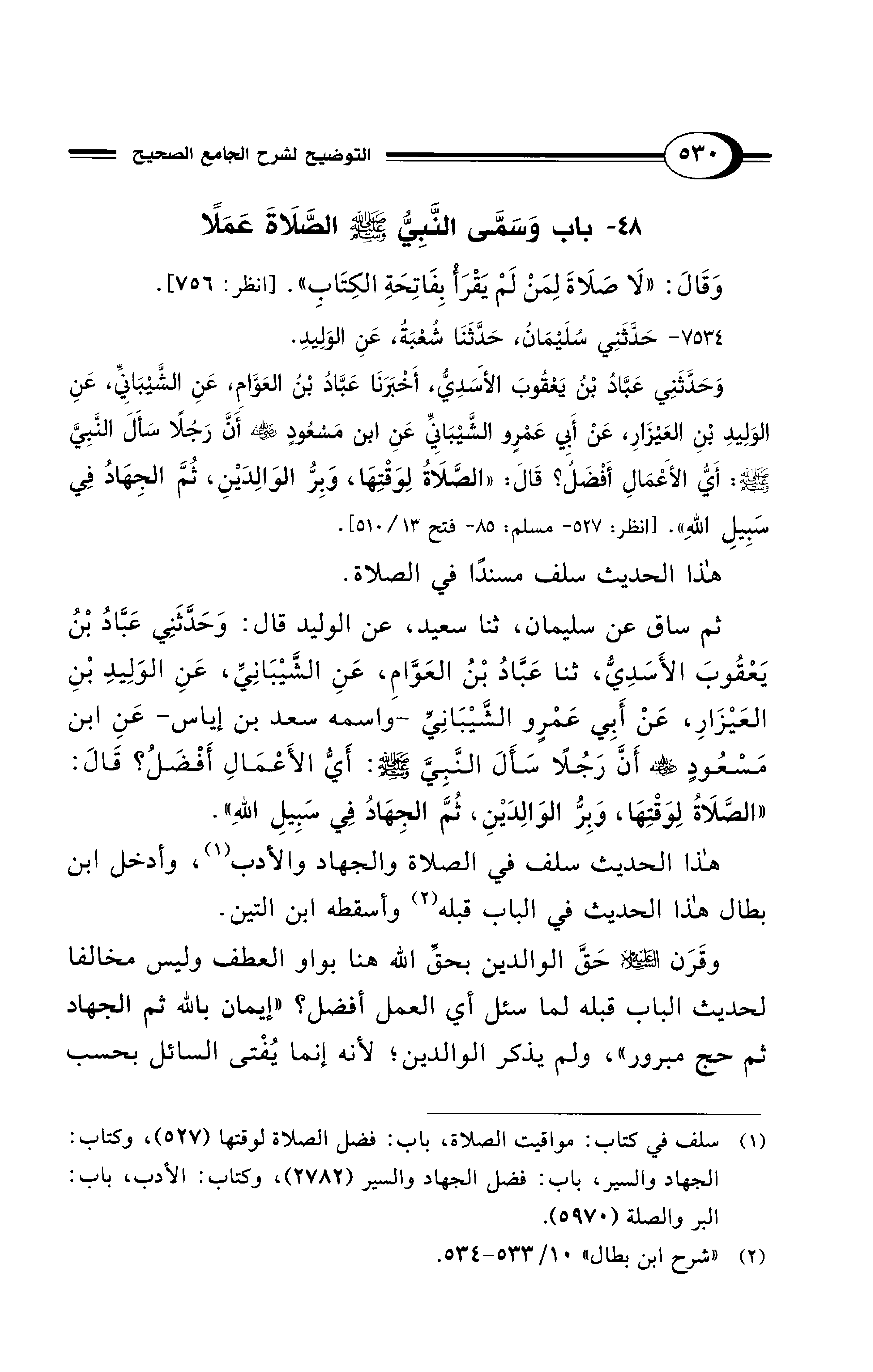 وَحَدَّثَنِي عَبَّادُ بْنُ يَعْقُوبَ الأَسَدِيُّ، أَخْبَرَنَا عَبَّادُ بْنُ العَوَّامِ، عَنِ الشَّيْبَانِيِّ، عَنِ الوَلِيدِ بْنِ العَيْزَارِ، عَنْ أَبِي عَمْرٍو الشَّيْبَانِيِّ عَنِ ابْنِ مَسْعُودٍ - رضي الله عنه - أَنَّ رَجُلاً سَأَلَ النَّبِيَّ - صلى الله عليه وسلم -: أَيُّ الأَعْمَالِ أَفْضَلُ؟ قَالَ: «الصَّلاَةُ لِوَقْتِهَا، وَبِرُّ الوَالِدَيْنِ، ثُمَّ الجِهَادُ فِي سَبِيلِ اللهِ» [انظر: 527 - مسلم: 85 - فتح 13/ 510].