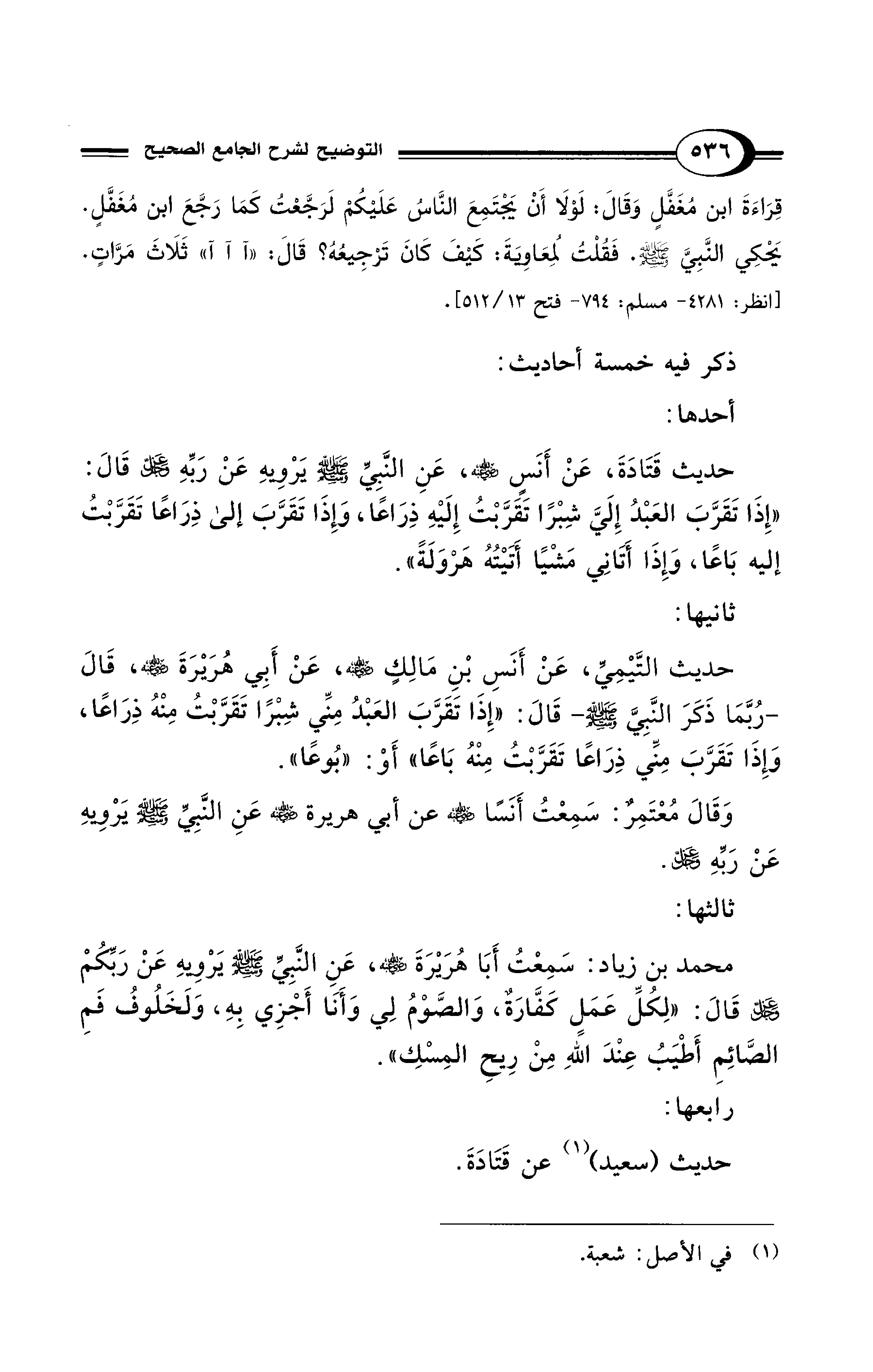 حديث قَتَادةَ، عَنْ أَنَسٍ - رضي الله عنه -، عَنِ النَّبِيَّ - صلى الله عليه وسلم - يَرْوِيهِ عَنْ رَبِّهِ -عَزَّ وَجَلَّ- قَالَ: "إِذَا تَقَرَّبَ العَبْدُ إلَيَّ شِبْرًا تَقَرَّبْتُ إِلَيْهِ ذِرَاعًا، وَإِذَا تَقَرَّبَ إِلَيَّ ذِرَاعًا تَقَرَّبْتُ إليه بَاعًا، وَإِذَا أَتَانِي مَشْيًا أَتَيْتُهُ هَرْوَلَةً".