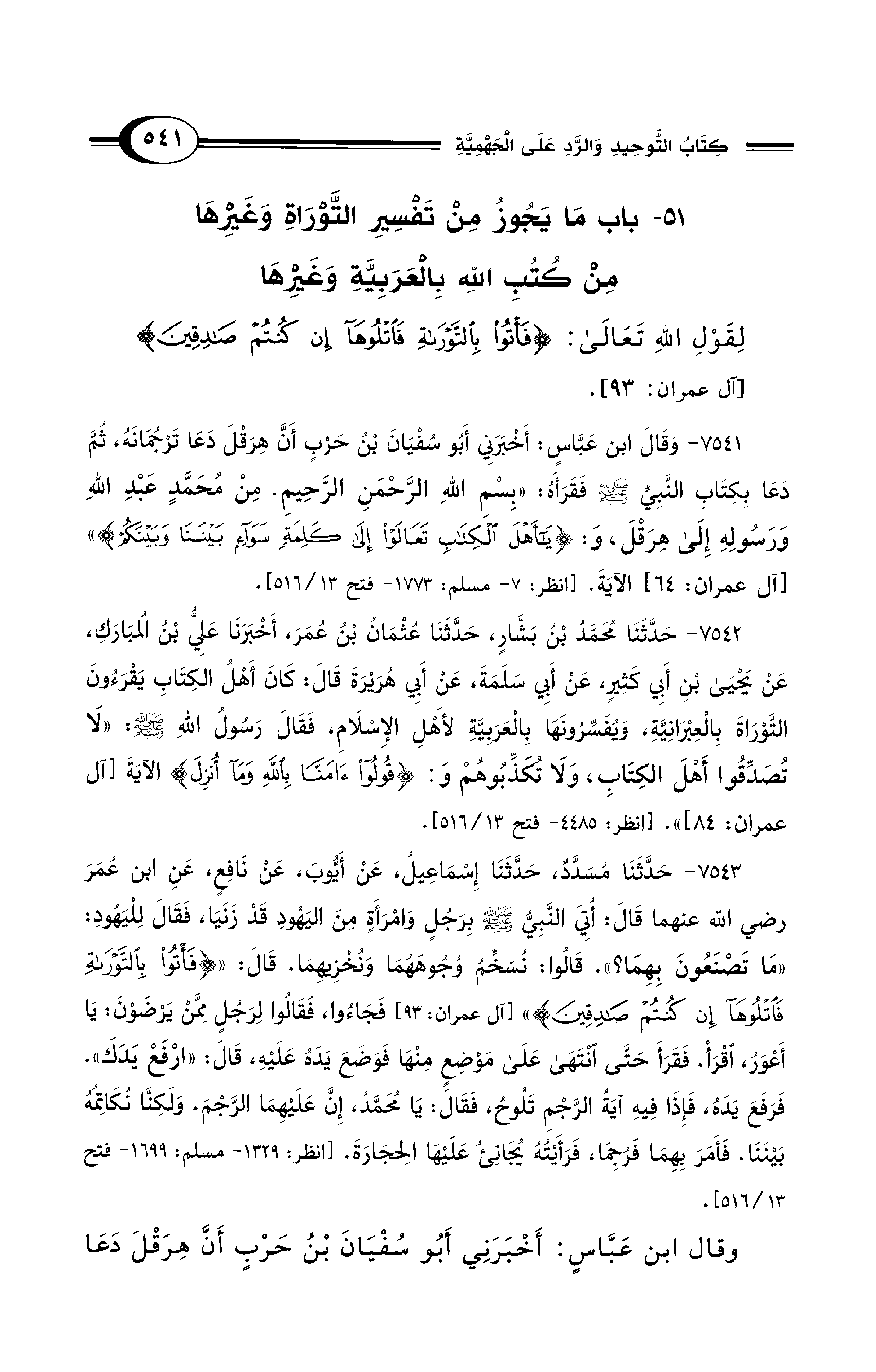 51 - باب مَا يَجُوزُ مِنْ تَفْسِيرِ التَّوْرَاةِ وَغَيْرِهَا مِنْ كُتُبِ اللهِ بِالْعَرَبِيَّةِ وَغَيْرِهَا