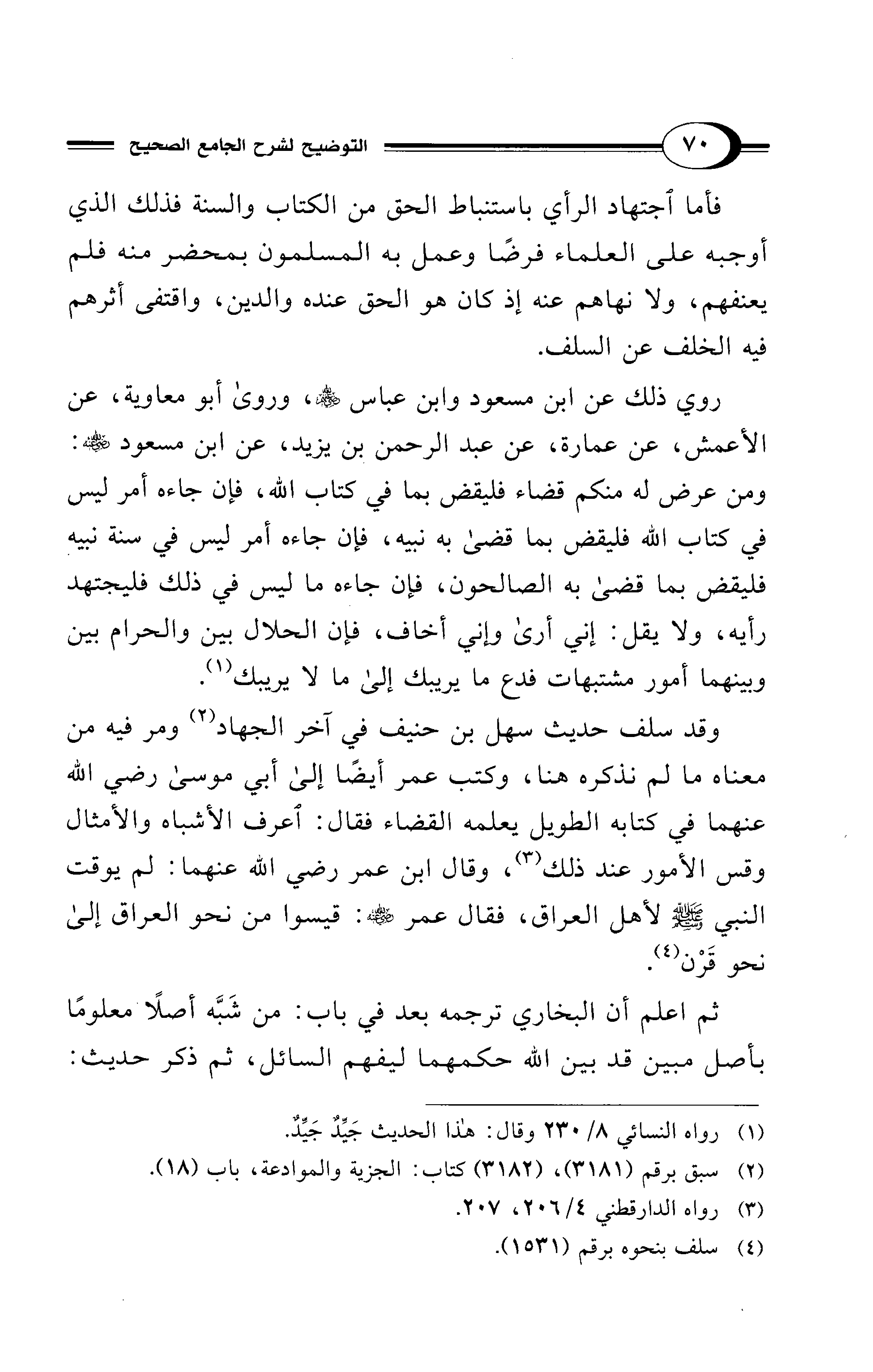 روي ذلك عن ابن مسعود وابن عباس - رضي الله عنه -، وروى أبو معاوية، عن الأعمش، عن عمارة، عن عبد الرحمن بن يزيد، عن ابن مسعود - رضي الله عنه -: ومن عرض له منكم قضاء فليقض بما في كتاب الله، فإن جاءه أمر ليس في كتاب الله فليقض بما قضى به نبيه، فإن جاءه أمر ليس في سنة نبيه فليقض بما قضى به الصالحون، فإن جاءه ما ليس في ذلك فليجتهد رأيه، ولا يقل: إني أرى وإني أخاف، فإن الحلال بين والحرام بين وبينهما أمور مشتبهات فدع ما يريبك إلى ما لا يريبك (¬1).
