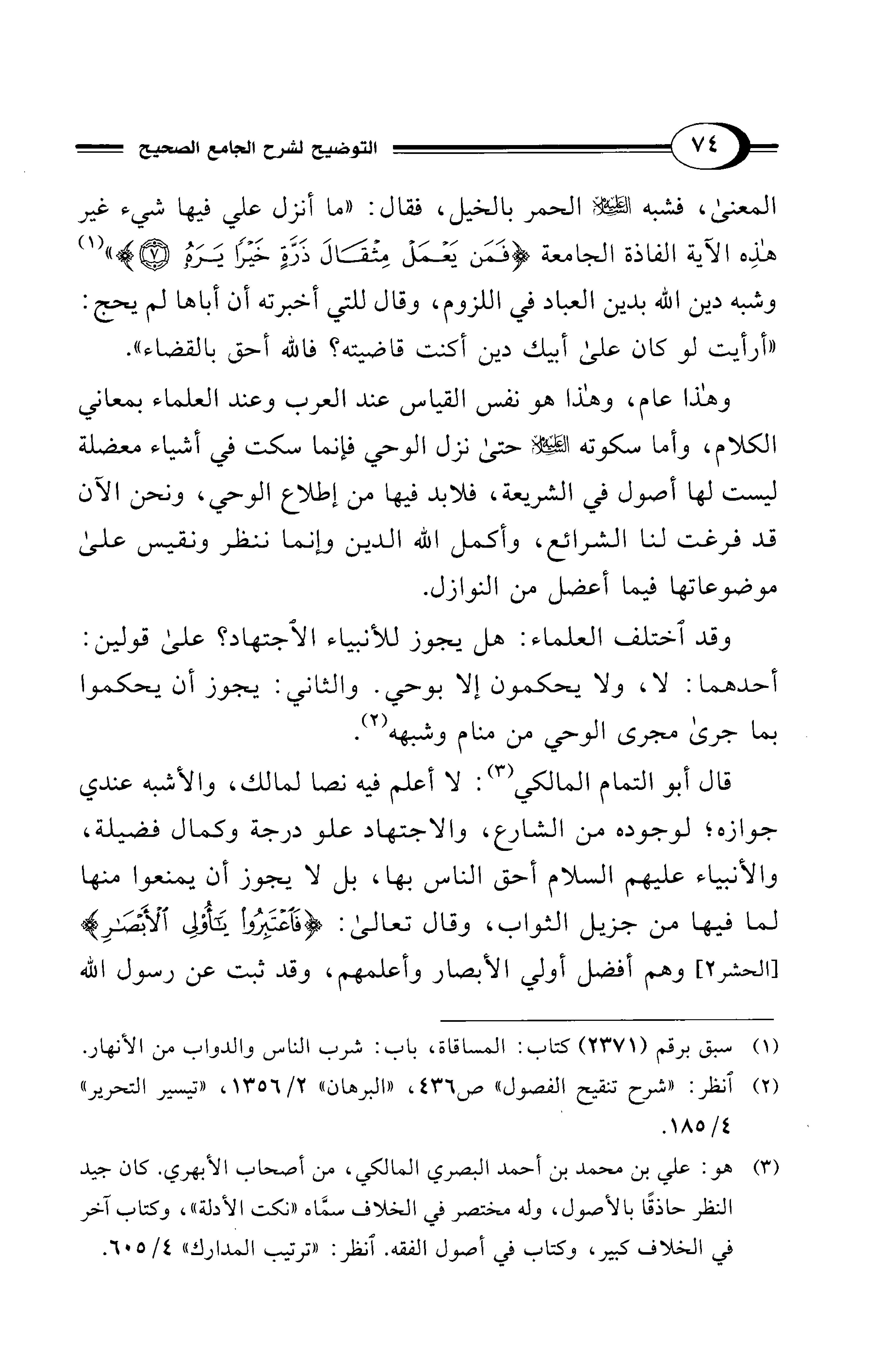 وهذا عام، وهذا هو نفس القياس عند العرب وعند العلماء بمعاني الكلام، وأما سكوته - عليه السلام - حتي نزل الوحي فإنما سكت في أشياء معضلة ليست لها أصول في الشريعة، فلابد فيها من إطلاع الوحي، ونحن الآن قد فرغت لنا الشرائع، وأكمل الله الدين وإنما ننظر ونقيس على موضوعاتها فيما أعضل من النوازل.