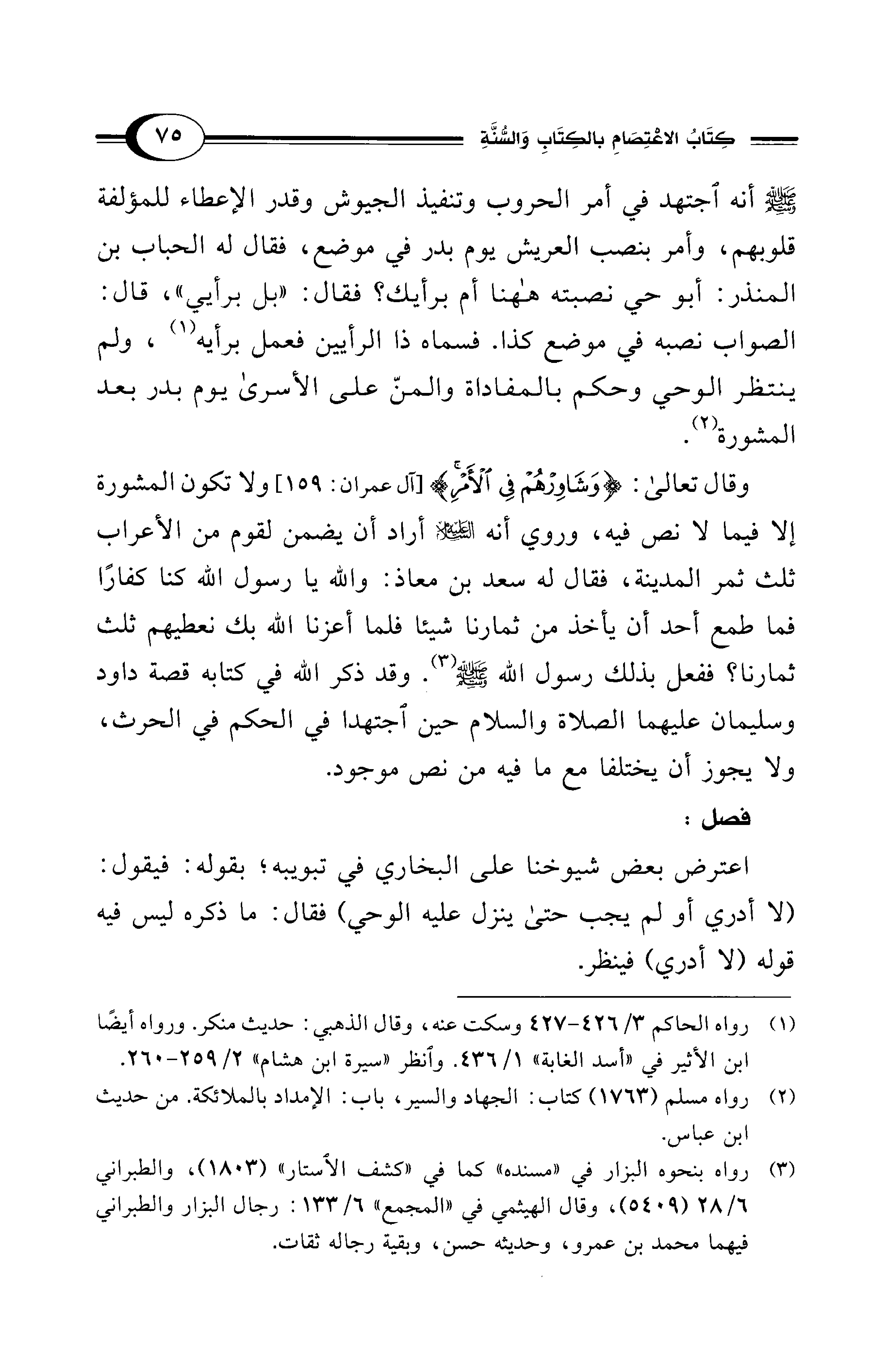 - صلى الله عليه وسلم - أنه اجتهد في أمر الحروب وتنفيذ الجيوش وقدر الإعطاء للمؤلفة قلوبهم، وأمر بنصب العريش يوم بدر في موضع، فقال له الحباب بن المنذر: أبو حي نصبته ههنا أم برأيك؟ فقال: "بل برأيي"، قال: الصواب نصبه في موضع كذا. فسماه ذا الرأيين فعمل برأيه (¬1)، ولم ينتظر الوحي وحكم بالمفاداة والمنّ على الأسري يوم بدر بعد المشورة (¬2).