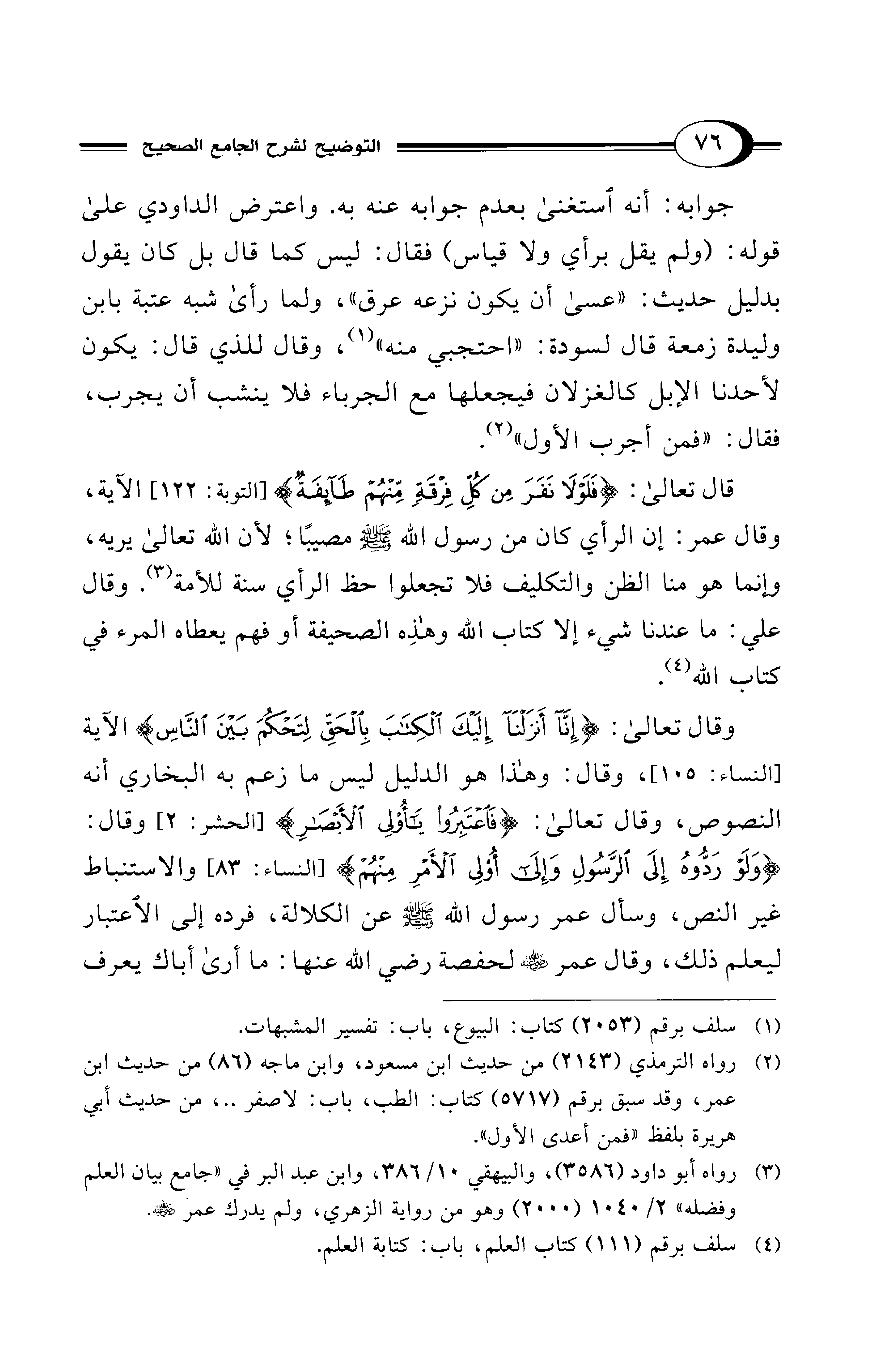 قال تعالي: {فَلَوْلَا نَفَرَ مِنْ كُلِّ فِرْقَةٍ مِنْهُمْ طَائِفَةٌ} [التوبة: 122] الآية، وقال عمر: إن الرأي كان من رسول الله - صلى الله عليه وسلم - مصيبًا؛ لأن الله تعالى يريه، "انما هو منا الظن والتكليف فلا تجعلوا حظ الرأي سنة للأمة (¬3). وقال علي: ما عندنا شيء إلا كتاب الله وهذه الصحيفة أو فهم يعطاه المرء في كتاب الله (¬4).