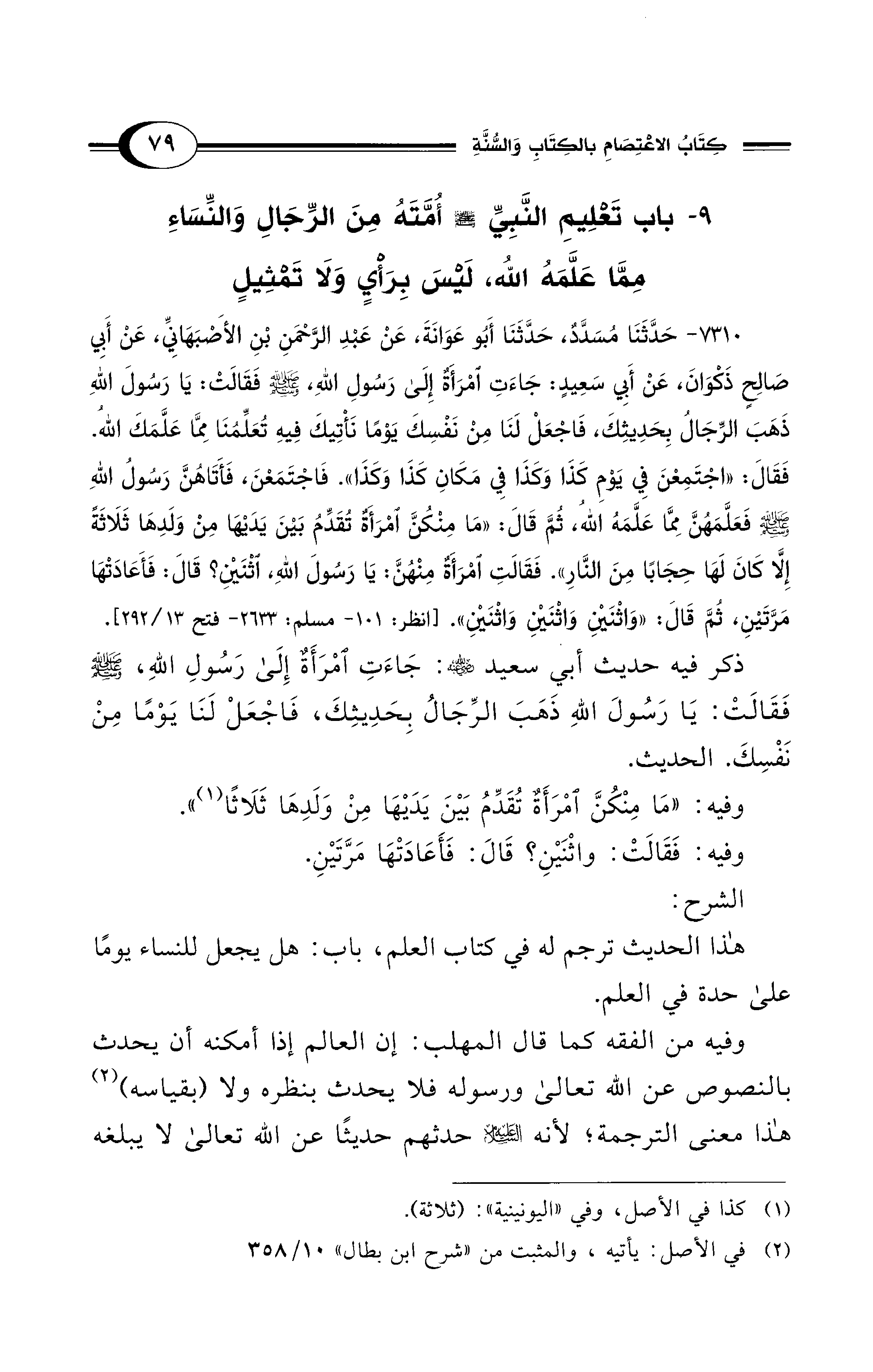 7310 - حَدَّثَنَا مُسَدَّدٌ، حَدَّثَنَا أَبُو عَوَانَةَ، عَنْ عَبْدِ الرَّحْمَنِ بْنِ الأَصْبَهَانِيِّ، عَنْ أَبِي صَالِحٍ ذَكْوَانَ، عَنْ أَبِي سَعِيدٍ: جَاءَتِ امْرَأَةٌ إِلَى رَسُولِ اللهِ - صلى الله عليه وسلم -، فَقَالَتْ: يَا رَسُولَ اللهِ ذَهَبَ الرِّجَالُ بِحَدِيثِكَ، فَاجْعَلْ لَنَا مِنْ نَفْسِكَ يَوْمًا نَأْتِيكَ فِيهِ تُعَلِّمُنَا مِمَّا عَلَّمَكَ اللهُ. فَقَالَ: «اجْتَمِعْنَ فِي يَوْمِ كَذَا وَكَذَا فِي مَكَانِ كَذَا وَكَذَا». فَاجْتَمَعْنَ، فَأَتَاهُنَّ رَسُولُ اللهِ - صلى الله عليه وسلم - فَعَلَّمَهُنَّ مِمَّا عَلَّمَهُ اللهُ ثُمَّ قَالَ: «مَا مِنْكُنَّ امْرَأَةٌ تُقَدِّمُ بَيْنَ يَدَيْهَا مِنْ وَلَدِهَا ثَلاَثَةً إِلاَّ كَانَ لَهَا حِجَابًا مِنَ النَّارِ». فَقَالَتِ امْرَأَةٌ مِنْهُنَّ: يَا رَسُولَ اللهِ، اثْنَيْنِ؟ قَالَ: فَأَعَادَتْهَا مَرَّتَيْنِ، ثُمَّ قَالَ: «وَاثْنَيْنِ وَاثْنَيْنِ وَاثْنَيْنِ». [انظر: 101 - مسلم: 2633 - فتح 13/ 292]