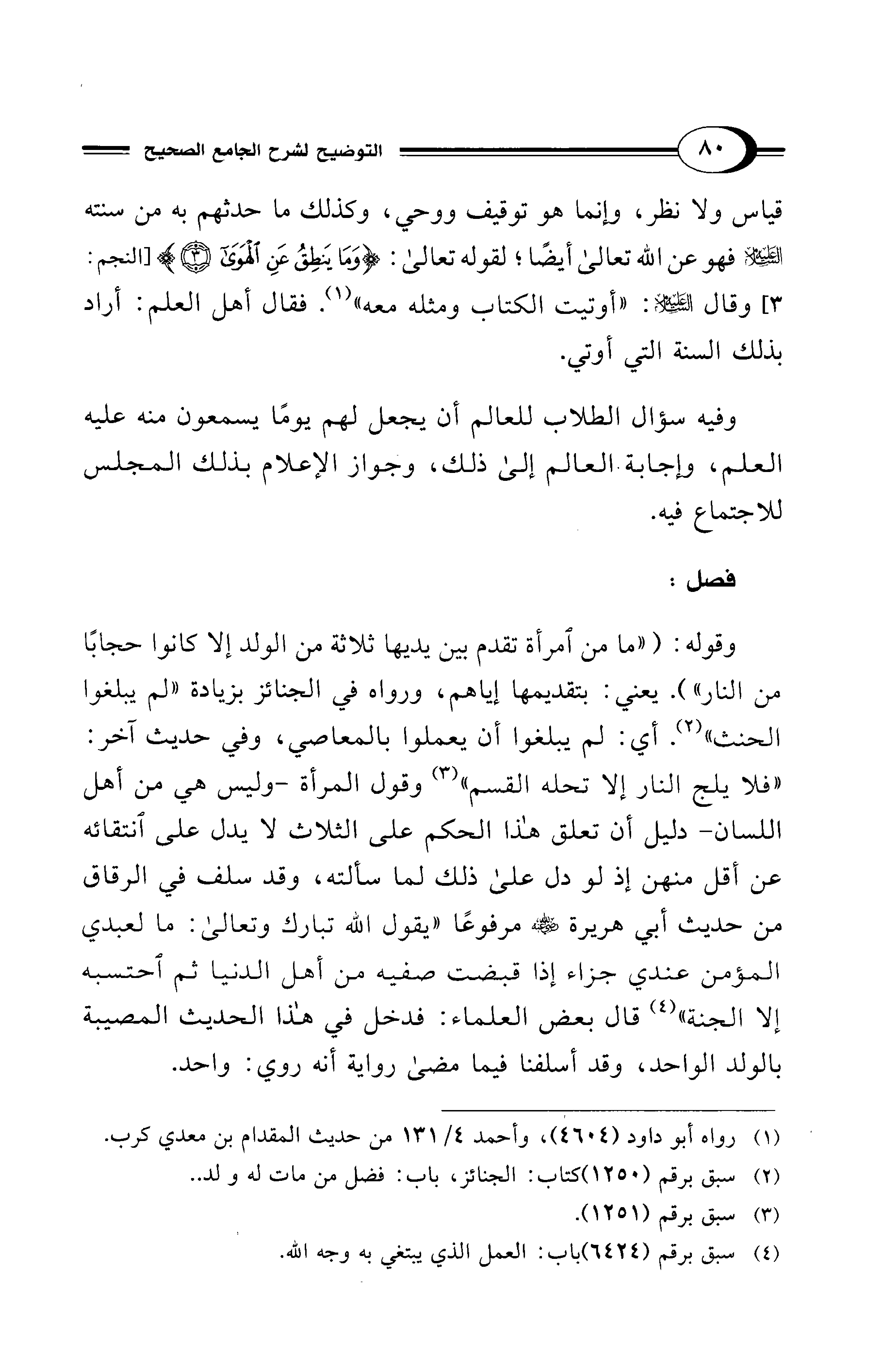 وقوله: ("ما من امرأة تقدم بين يديها ثلاثة من الولد إلا كانوا حجابًا من النار"). يعني: بتقديمها إياهم، ورواه في الجنائز بزيادة "لم يبلغوا الحنث" (¬2). أي: لم يبلغوا أن يعملوا بالمعاصي، وفي حديث آخر: "فلا يلج النار إلا تحله القسم" (¬3) وقول المرأة -وليس هي من أهل اللسان- دليل أن تعلق هذا الحكم على الثلاث لا يدل على انتقائه عن أقل منهن إذ لو دل على ذلك لما سألته، وقد سلف في الرقاق من حديث أبي هريرة - رضي الله عنه - مرفوعًا "يقول الله تبارك وتعالى: ما لعبدي