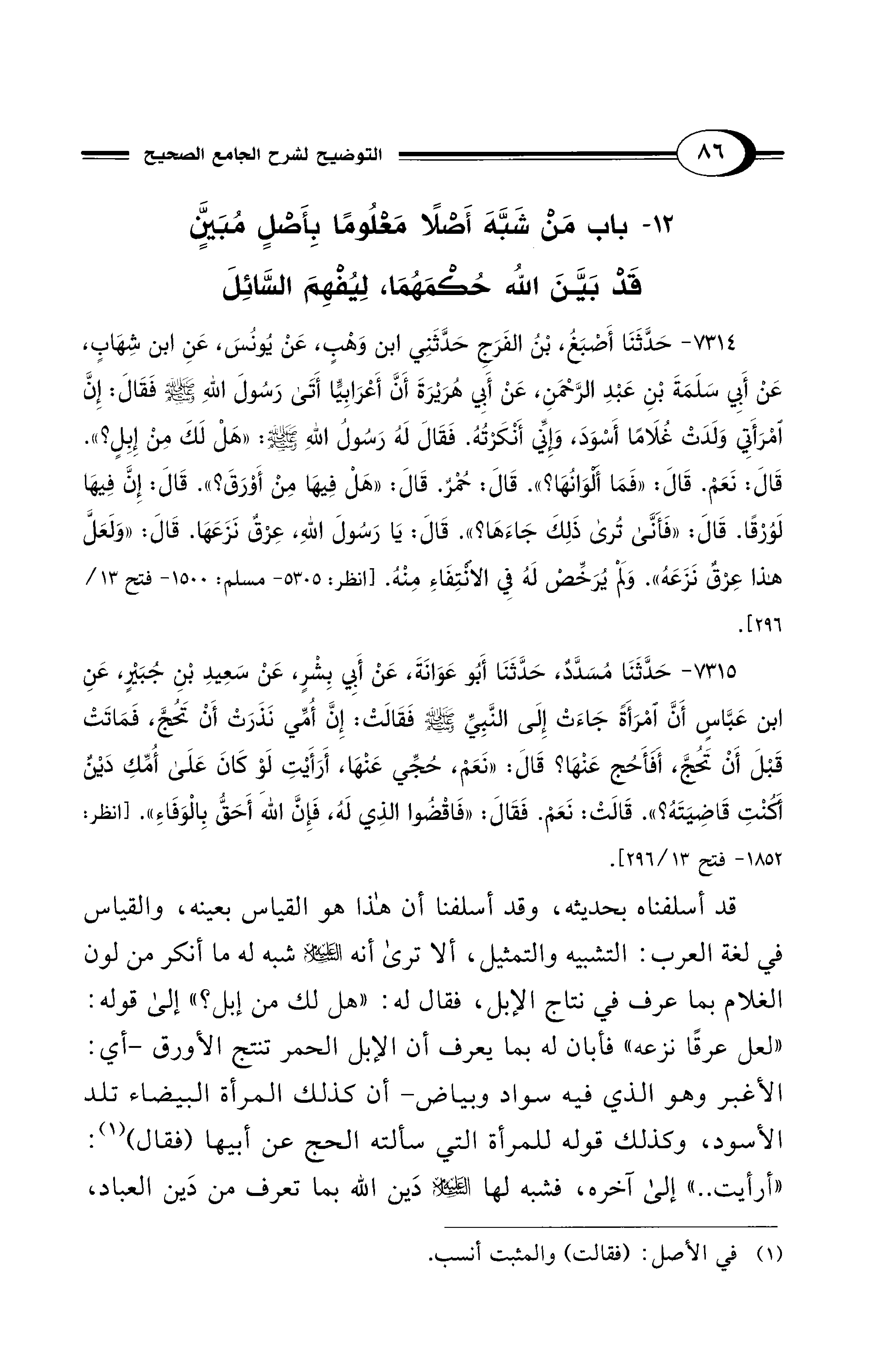 12 - باب مَنْ شَبَّهَ أَصْلاً مَعْلُومًا بِأَصْلٍ مُبَيَّنٍ قَدْ بَيَّنَ اللهُ حُكْمَهُمَا، لِيُفْهِمَ السَّائِلَ