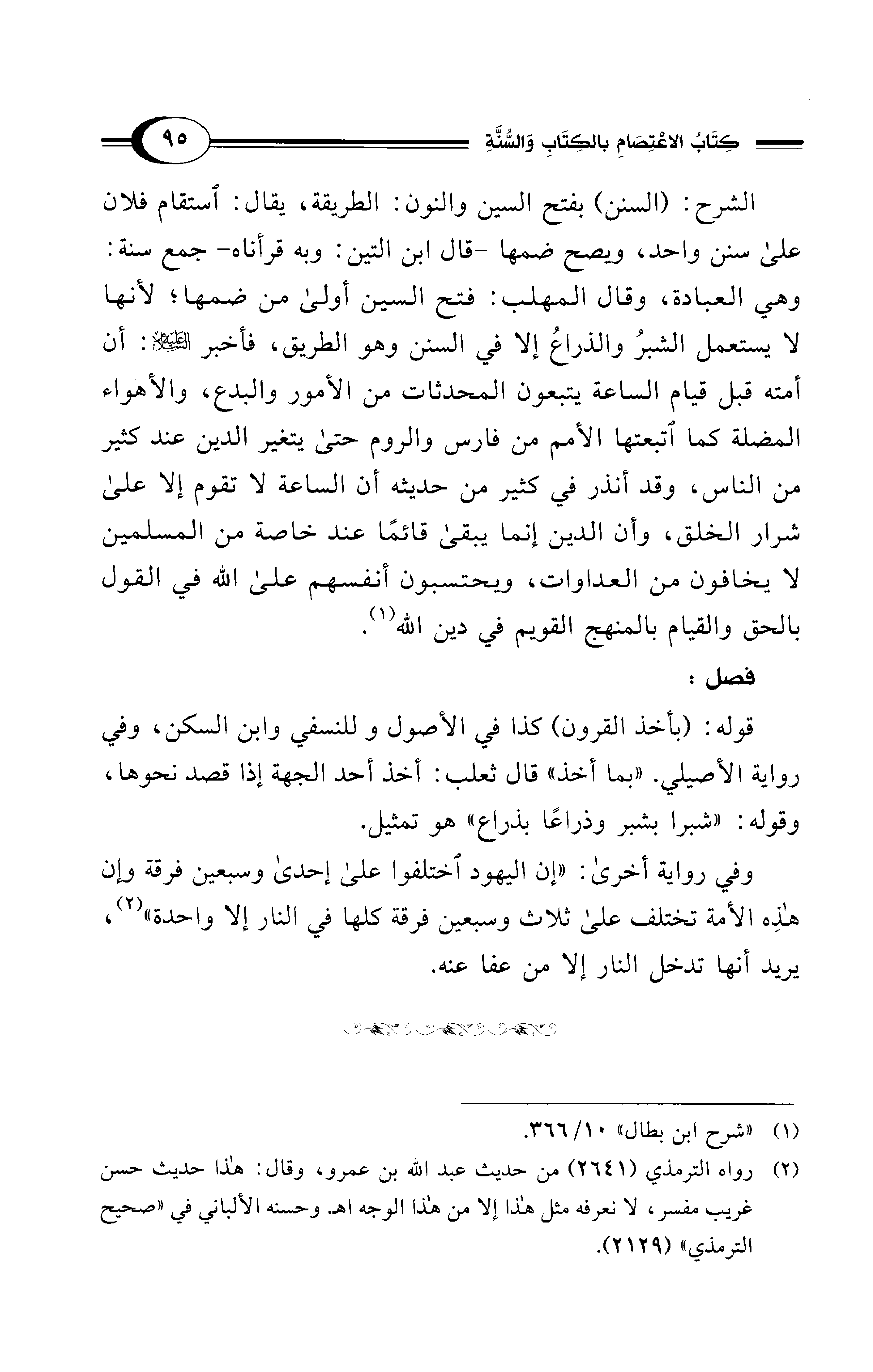 الشرح: (السنن) بفتح السين والنون: الطريقة، يقال: استقام فلان علي سنن واحد، ويصح ضمها -قال ابن التين: وبه قرأناه- جمع سنة: وهي العبادة، وقال المهلب: فتح السين أولى من ضمها؛ لأنها لا يستعمل الشبرُ والذراعُ إلا في السنن وهو الطريق، فأخبر - عليه السلام -: أن أمته قبل قيام الساعة يتبعون المحدثات من الأمور والبدع، والأهواء المضلة كما اتبعتها الأمم من فارس والروم حتي يتغير الدين عند كثير من الناس، وقد أنذر في كثير من حديثه أن الساعة لا تقوم إلا على شرار الخلق، وأن الدين إنما يبقي قائمًا عند خاصة من المسلمين لا يخافون من العداوات، ويحتسبون أنفسهم على الله في القول بالحق والقيام بالمنهج القويم في دين الله (¬1).