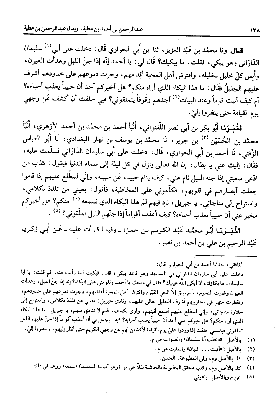 قال ونا محمد بن عبد العزيز ثنا ابن أبي الحواري قال دخلت على أبي (1) سليمان الداراني وهو يبكي فقلت ما يبكيك قال لي يا أحمد إنه إذا جن الليل وهدأت العيون وانس كل خليل بخليله وافترش أهل المحبة أقدامهم وجرت دموعهم على خدودهم أشرف عليهم الجليل فقال ما هذا البكاء الذي أراه منكم هل أخبركم أحد أن حبيبا يعذب أحباءه أم كيف أبيت قوما وعند البيات (2) أجدهم وقوفا يتملقوني فبي حلفت أن أكشف عن وجهي يوم القيامة حتى ينظروا إلي أخبرنا أبو بكر بن أبي نصر اللفتواني أنبأ أحمد بن محمد بن أحمد الأزهري أنبأ محمد بن الحسين (3) بن جرير نا محمد بن يوسف بن نهار البغدادي نا أبو العباس الزفتي نا أحمد بن أبي الحواري قال دخلت على أبي سليمان الداراني فسلمت عليه فقال إليك عني يا بطال إن الله تعالى ينزل في كل ليلة إلى سماء الدنيا فيقول كذب من ادعى محبتي إذا جنة الليل نام عني كيف ينام حبيب عن حبيبه وإني لمطلع عليهم إذا قاموا جعلت أبصارهم في قلوبهم فكلموني على المخاطبة فأقول بعيني من تلذذ بكلامي واستراح إلى مناجاتي يا جبريل ناد فيهم لم هذا البكاء الذي نسمعه (4) منكم هل أخبركم مخبر عني أن حبيبا يعذب أحباءه كيف أعذب أقواما إذا جنهم الليل تملقوني (5) أخبرنا أبو محمد عبد الكريم بن حمزة وفيما قرأت عليه عن أبي زكريا عبد الرحيم بن علي بن أحمد بن نصر