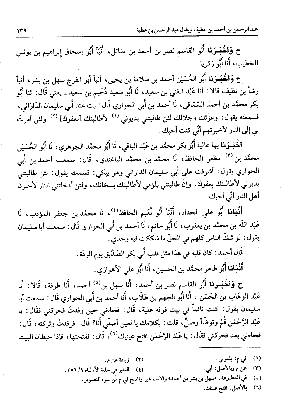 ح وأخبرنا أبو القاسم نصر بن أحمد بن مقاتل أنبأ أبو إسحاق إبراهيم بن يونس الخطيب أنا أبو زكريا ح وأخبرنا أبو الحسين أحمد بن سلامة بن يحيى أنبأ أبو الفرج سهل بن بشر أنبأ رشأ بن نظيف قالا أنا عبد الغني بن سعيد نا أبو سعيد دحيم بن سعيد يعني قال ثنا أبو بكر محمد بن أحمد السماقي نا أحمد بن أبي الحواري قال بت عند أبي سليمان الداراني فسمعته يقول وعزتك وجلالك لئن طالبتني بديوني (1) لأطالبنك بعفوك (2) ولئن أمرت بي إلى النار لأخبرتهم أني كنت أحبك أخبرنا بها عالية أبو بكر محمد بن عبد الباقي نا أبو محمد الجوهري نا أبو الحسين محمد بن (3) مظفر الحافظ نا محمد بن محمد الباغندي قال سمعت أحمد بن أبي الحواري يقول أشرفت على أبي سليمان الداراني وهو يبكي فسمعته يقول لئن طالبتني بديوني لأطالبنك بعفوك وإن طالبتني بلؤمي لأطالبنك بسخائك ولئن أدخلتني النار لأخبرن أهل النار أني أحبك أنبأنا أبو علي الحداد أنبأ أبو نعيم الحافظ (4) نا محمد بن جعفر المؤدب نا عبد الله بن محمد بن يعقوب نا أبو حاتم نا أحمد بن أبي الحواري قال سمعت أبا سليمان يقول لو شك الناس كلهم في الحق ما شككت فيه وحدي قال أحمد كان قلبه في هذا مثل قلب أبي بكر الصديق يوم الردة أنبأنا أبو طاهر محمد بن الحسين أنا أبو علي الأهوازي ح وأخبرنا أبو القاسم نصر بن أحمد أنا سهل بن (5) أحمد أنا طرفة قالا أنا عبد الوهاب بن الحسن أنا أبو الجهم بن طلاب أنا أحمد بن أبي الحواري قال سمعت أبا سليمان يقول كنت نائما في بيت فوقه علية قال فجاءني حين رقدت فحركني فقال يا عبد الرحمن قم وتوضأ وصل قلت بكلامك يا لعين أصلي أنا قال فرقدت وتركته قال فجاءني بعد فحركني فقال يا عبد الرحمن افتح عينيك (6) قال ففتحتها فإذا حيطان البيت