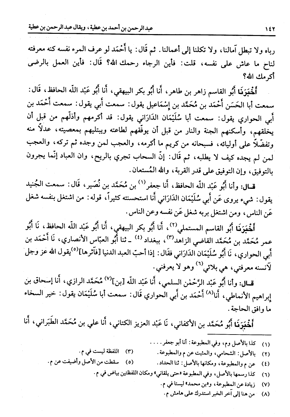 رباه ولا تبطل آمالنا ولا تكلنا إلى أعمالنا ثم قال يا أحمد لو عرف المرء نفسه كنه معرفته لناح ما عاش على نفسه قلت فأين الرجاء رحمك الله قال فأين العمل بالرضى أكرمك الله أخبرنا أبو القاسم زاهر بن طاهر أنا أبو بكر البيهقي أنا أبو عبد الله الحافظ قال سمعت أبا الحسن أحمد بن محمد بن إسماعيل يقول سمعت أبي يقول سمعت أحمد بن أبي الحواري يقول سمعت أبا سليمان الداراني يقول قد أكرمهم وأذلهم من قبل أن يخلقهم وأسكنهم الجنة والنار من قبل أن يوفقهم لطاعته ويبتليهم بمعصيته عدلا منه وتفضلا على أوليائه فسبحانه من كريم ما أكرمه والعجب لمن وجده ثم تركه والعجب لمن لم يجده كيف لا يطلبه ثم قال إن السحاب تجري بالريح وإن العباد إنما يجرون بالتوفيق وإن التوفيق على قدر القربة والله المستعان قال وأنا أبو عبد الله الحافظ أنا جعفر (1) بن محمد بن نصير قال سمعت الجنيد يقول شئ يروى عن أبي سليمان الداراني أنا استحسنته كثيرا قوله من اشتغل بنفسه شغل عن الناس ومن اشتغل بربه شغل عن نفسه وعن الناس أخبرنا أبو القاسم المستملي (2) أنا أبو بكر البيهقي أنا أبو عبد الله الحافظ نا أبو عمر محمد بن محمد القاضي الزاهد (3) ببغداد (4) ثنا أبو العباس الأنصاري نا أحمد بن أبي الحواري نا أبو سليمان الداراني فقال إذا أحب العبد الدنيا فأثرها (5) يقول الله عز وجل لآنسنه معرفتي هي بلائي (6) وهو لا يعرفني قال وأنا أبو عبد الرحمن السلمي أنا عبد الله بن (7) محمد الرازي أنا إسحاق بن إبراهيم الأنماطي أنا (8) أحمد بن أبي الحواري قال سمعت أبا سليمان يقول خير السخاء ما وافق الحاجة أخبرنا أبو محمد بن الأكفاني نا عبد العزيز الكتاني أنا