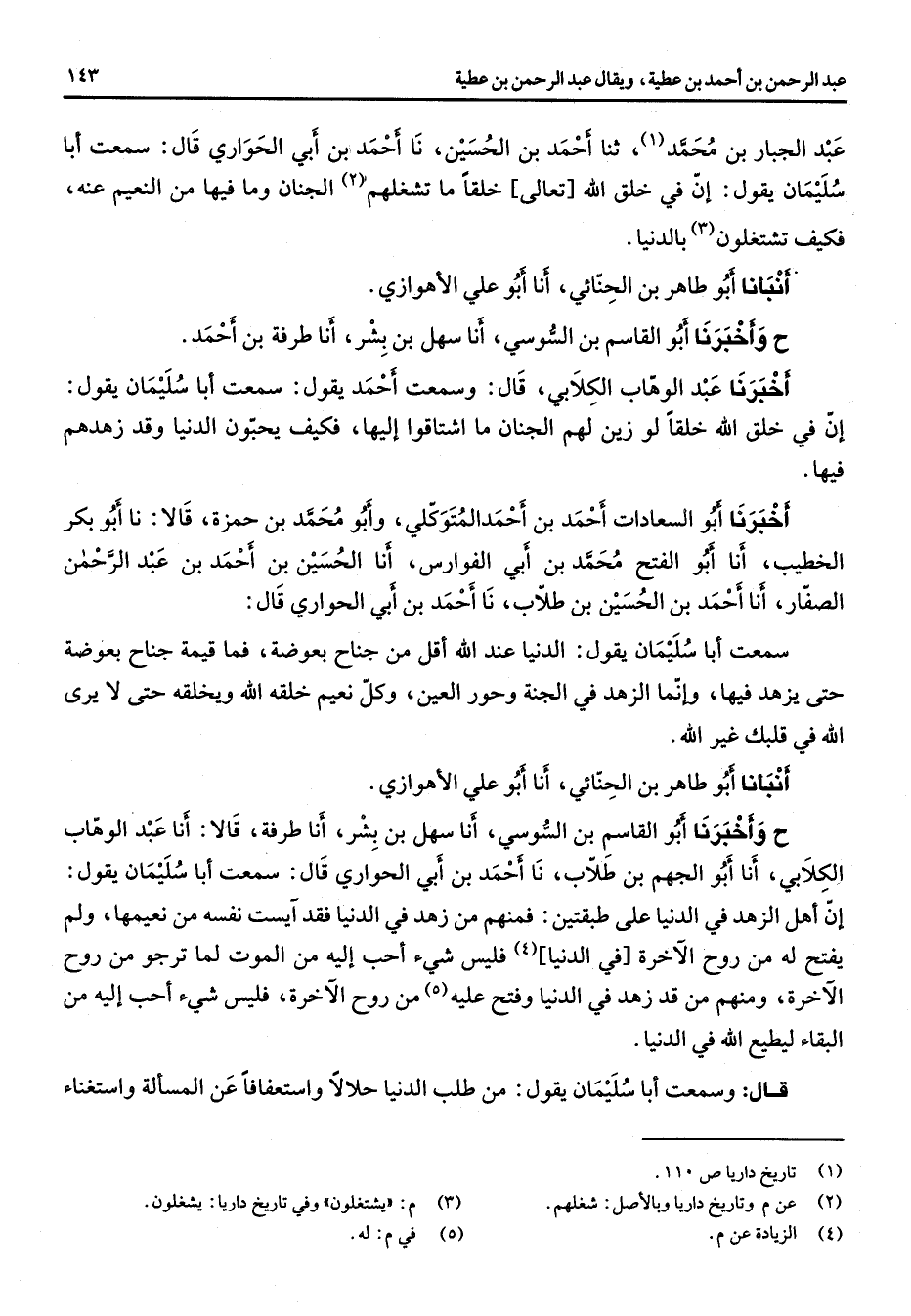 علي بن محمد (1) الطبراني أنا عبد الجبار بن محمد ثنا أحمد بن الحسين نا أحمد بن أبي الحواري قال سمعت أبا سليمان يقول إن في خلق الله تعالى خلقا ما تشغلهم (2) الجنان وما فيها من النعيم عنه فكيف تشتغلون (3) بالدنيا أنبأنا أبو طاهر بن الحنائي أنا أبو علي الأهوازي ح وأخبرنا أبو القاسم بن السوسي أنا سهل بن بشر أنا طرفة بن أحمد أخبرنا عبد الوهاب الكلابي قال وسمعت أحمد يقول سمعت أبا سليمان يقول إن في خلق الله خلقا لو زين لهم الجنان ما اشتاقوا إليها فكيف يحبون الدنيا وقد زهدهم فيها أخبرنا أبو السعادات أحمد بن أحمد المتوكلي وأبو محمد بن حمزة قالا نا أبو بكر الخطيب أنا أبو الفتح محمد بن أبي الفوارس أنا الحسين بن أحمد بن عبد الرحمن الصفار أنا أحمد بن الحسين بن طلاب نا أحمد بن أبي الحواري قال سمعت أبا سليمان يقول الدنيا عند الله أقل من جناح بعوضة فما قيمة جناح بعوضة حتى يزهد فيها وإنما الزهد في الجنة وحور العين وكل نعيم خلقه الله ويخلقه حتى لا يرى الله في قلبك غير الله أنبأنا أبو طاهر بن الحنائي أنا أبو علي الأهوازي ح وأخبرنا أبو القاسم بن السوسي أنا سهل بن بشر أنا طرفة قالا أنا عبد الوهاب الكلابي أنا أبو الجهم بن طلاب نا أحمد بن أبي الحواري قال سمعت أبا سليمان يقول إن أهل الزهد في الدنيا على طبقتين فمنهم من زهد في الدنيا فقد آيست نفسه من نعيمها ولم يفتح له من روح الآخرة في الدنيا (4) فليس شئ أحب إليه من الموت لما ترجو من روح الآخرة ومنهم من قد زهد في الدنيا وفتح عليه (5) من روح الآخرة فليس شئ أحب إليه من البقاء ليطيع الله في الدنيا قال وسمعت أبا سليمان يقول من طلب الدنيا حلالا واستعفافا عن المسألة واستغناء