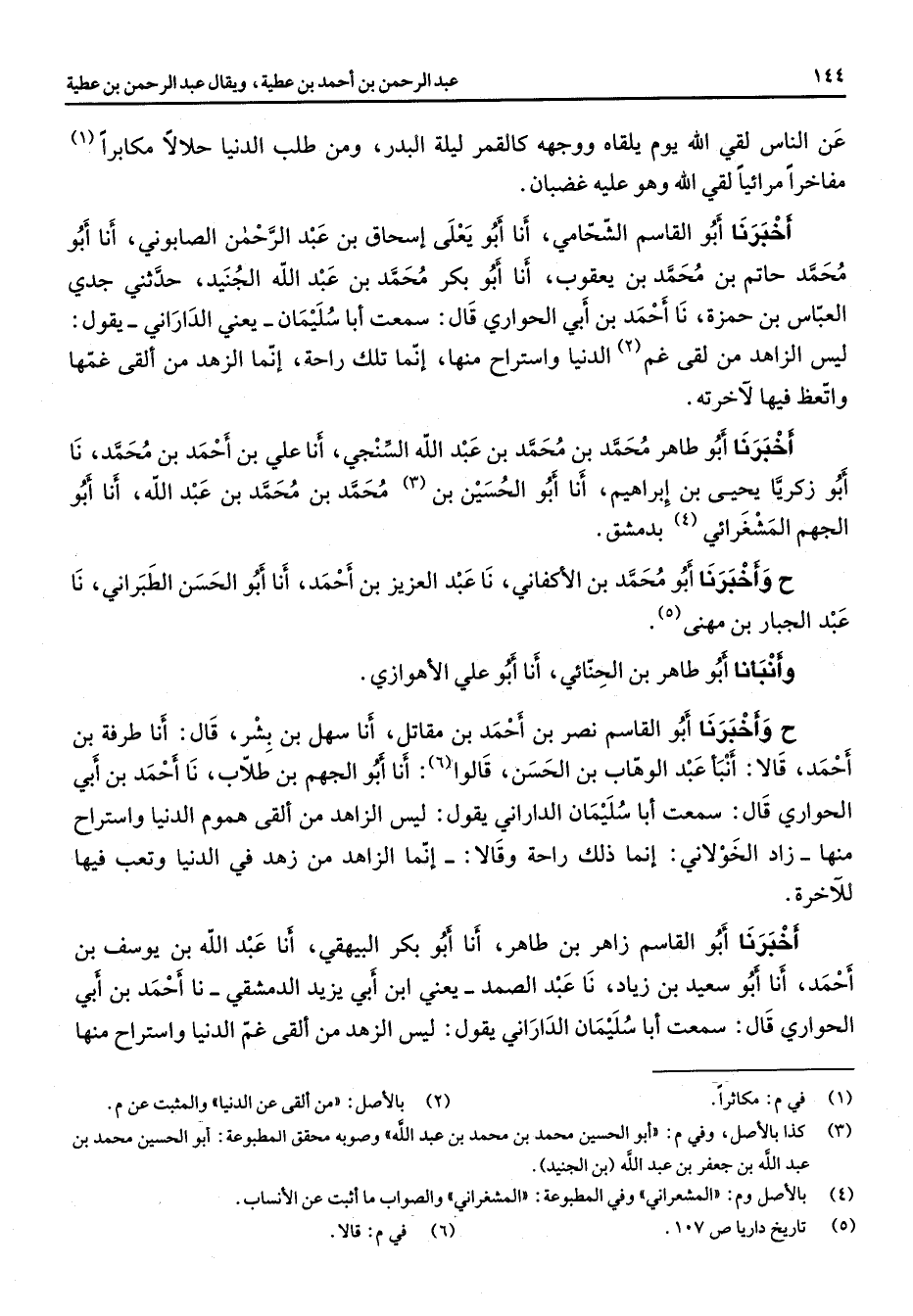 عن الناس لقي الله يوم يلقاه ووجهه كالقمر ليلة البدر ومن طلب الدنيا حلالا مكابرا (1) مفاخرا مرائيا لقي الله وهو عليه غضبان أخبرنا أبو القاسم الشحامي أنا أبو يعلى إسحاق بن عبد الرحمن الصابوني أنا أبو محمد حاتم بن محمد بن يعقوب أنا أبو بكر بن عبد الله الجنيد حدثني جدي العباس بن حمزة نا أحمد بن أبي الحواري قال سمعت أبا سليمان يعني الداراني يقول ليس الزاهد من لقي غم (2) الدنيا واستراح منها إنما تلك راحة إنما الزهد من ألقى غمها واتعظ فيها لآخرته أخبرنا أبو طاهر محمد بن محمد بن عبد الله السنجي أنا علي بن أحمد بن محمد نا أبو زكريا يحيى بن إبراهيم أنا أبو الحسين بن (3) محمد بن محمد بن عبد الله أنا أبو الجهم المشغرائي (4) بدمشق ح وأخبرنا أبو محمد بن الأكفاني نا عبد العزيز بن أحمد أنا أبو الحسن الطيراني نا عبد الجبار بن مهنى (5) وأنبأنا أبو طاهر بن الحنائي أنا أبو علي الأهوازي ح وأخبرنا أبو القاسم نصر بن أحمد بن مقاتل أنا سهل بن بشر قال أنا طرفة بن أحمد قالا أنبأ عبد الوهاب بن الحسن قالوا (6) أنا أبو الجهم بن طلاب نا أحمد بن أبي الحواري قال سمعت أبا سليمان الداراني يقول ليس الزاهد من ألقى هموم الدنيا واستراح منها زاد الخولاني إنما ذلك راحة وقالا إنما الزاهد من زهد في الدنيا وتعب فيها للآخرة أخبرنا أبو القاسم زاهر بن طاهر أنا أبو بكر البيهقي أنا عبد الله بن يوسف بن أحمد أنا أبو سعيد بن زياد نا عبد الصمد يعني ابن أبي يزيد الدمشقي نا أحمد بن أبي الحواري قال سمعت أبا سليمان الداراني يقول ليس الزاهد من ألقى غم الدنيا واستراح منها