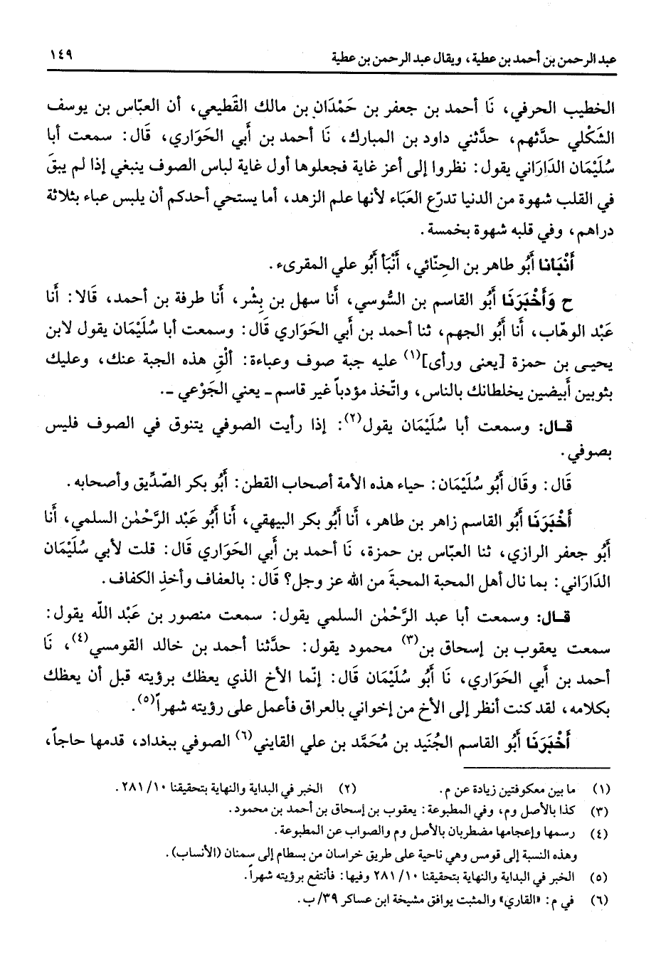 الخطيب الحرفي نا أحمد بن جعفر بن حمدان بن مالك القطيعي أن العباس بن يوسف الشكلي حدثهم حدثني داود بن المبارك نا أحمد بن أبي الحواري قال سمعت أبا سليمان الداراني يقول نظروا إلى أعز غاية فجعلوها أول غاية لباس الصوف ينبغي إذا لم يبق في القلب شهوة من الدنيا تدرع العباء لأنها علم الزهد أما يستحي أحدكم أن يلبس عباء بثلاثة دراهم وفي قلبه شهوة بخمسة أنبأنا أبو طاهر بن الحنائي أنبأ أبو علي المقرئ ح وأخبرنا أبو القاسم بن السوسي أنا سهل بن بشر أنا طرفة بن أحمد قالا أنا عبد الوهاب أنا أبو الجهم ثنا أحمد بن أبي الحواري قال وسمعت أبا سليمان يقول لابن يحيى بن حمزة يعني ورأى (1) عليه جبة صوف وعباءة ألق هذه الجبة عنك وعليك بثوبين أبيضين يخلطانك بالناس واتخذ مؤدبا غير قاسم يعني الجوعي قال وسمعت أبا سليمان يقول (2) إذا رأيت الصوفي يتنوق في الصوف فليس بصوفي قال وقال أبو سليمان حياء هذه الأمة أصحاب القطن أبو بكر الصديق وأصحابه أخبرنا أبو القاسم زاهر بن طاهر أنا أبو بكر البيهقي أنا أبو عبد الرحمن السلمي أنا أبو جعفر الرازي ثنا العباس بن حمزة نا أحمد بن أبي الحواري قال قلت لأبي سليمان الداراني بما نال أهل المحبة من الله عز وجل قال بالعفاف وأخذ الكفاف قال وسمعت أبا عبد الرحمن السلمي يقول سمعت منصور بن عبد الله يقول سمعت يعقوب بن إسحاق بن (3) محمود يقول حدثنا أحمد بن خالد القومسي (4) نا أحمد بن الحواري نا أبو سليمان قال إنما الأخ الذي يعظك برؤيته قبل أن يعظك بكلامه لقد كنت انظر إلى الأخ من اخواني بالعراق فأعمل على رؤيته شهرا (5) أخبرنا أبو القاسم الجنيد بن محمد بن علي القايني (6) الصوفي ببغداد قدمها حاجا