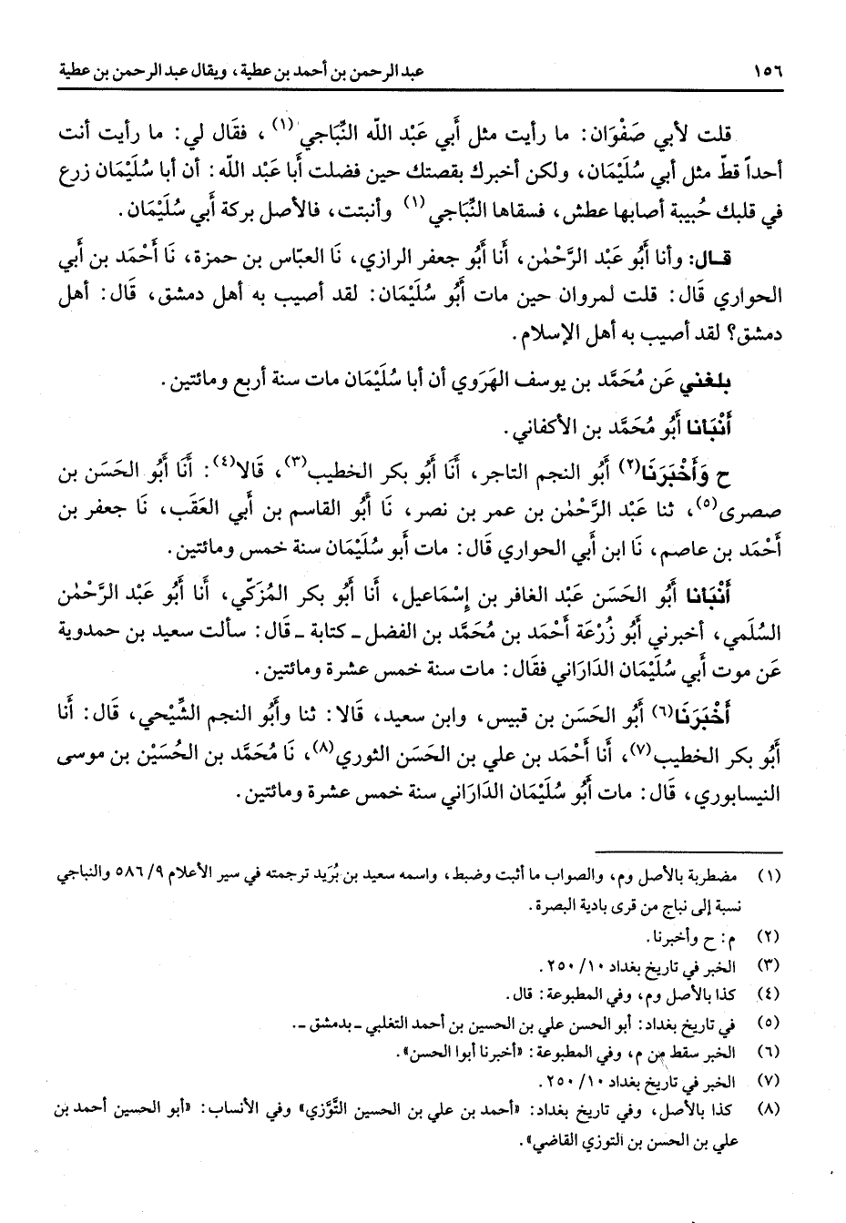 قلت لأبي صفوان ما رأيت مثل أبي عبد الله النباجي (1) فقال لي ما رأيت أنت أحدا قط مثل أبي سليمان ولكن أخبرك بقصتك حين فضلت أبا عبد الله أن أبا سليمان زرع في قلبك حبيبة أصابها عطش فسقاها النباجي (1) وأنبتت فالأصل بركة أبي سليمان قال وأنا أبو عبد الرحمن أنا أبو جعفر الرازي نا العباس بن حمزة نا أحمد بن أبي الحواري قال قلت لمروان حين مات أبو سليمان لقد أصيب به أهل دمشق قال أهل دمشق لقد أصيب به أهل الإسلام بلغني عن محمد بن يوسف الهروي أن أبا سليمان مات سنة أربع ومائتين أنبأنا أبو محمد بن الأكفاني ح وأخبرنا (2) أبو النجم التاجر أنا أبو بكر الخطيب (3) قالا (4) أنا أبو الحسن بن صصرى (5) ثنا عبد الرحمن بن عمر بن نصر نا أبو القاسم بن أبي العقب نا جعفر بن أحمد بن عاصم نا ابن أبي الحواري قال مات أبو سليمان سنة خمس ومائتين أنبأنا أبو الحسن عبد الغافر بن إسماعيل أنا أبو بكر المزكي أنا أبو عبد الرحمن السلمي أخبرني أبو زرعة أحمد بن محمد بن الفضل كتابة قال سألت سعيد بن حمدوية عن موت أبي سليمان الداراني فقال مات سنة خمس عشرة ومائتين أخبرنا (6) أبو الحسن بن قبيس وابن سعيد قالا ثنا وأبو النجم الشيحي قال أنا أبو بكر الخطيب (7) أنا أحمد بن علي بن الحسن الثوري (8) نا محمد بن الحسين بن موسى النيسابوري قال مات أبو سليمان الداراني سنة خمس عشرة ومائين