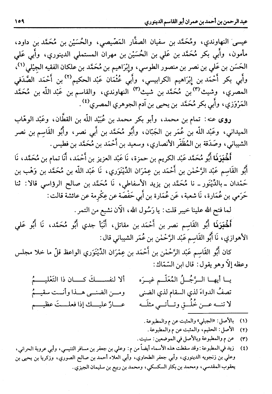 عيسى النهاوندي ومحمد بن سفيان الصفار المصيصي والحسين بن محمد بن داود مأمون وأبي بكر محمد بن علي بن الحسين بن مهران المستملي الدينوري وأبي علي الحسن بن علي بن نصر بن منصور الطوسي وإبراهيم بن محمد بن علكان الفقيه الجيلي (1) وأبي بكر أحمد بن إبراهيم الكرابيسي وأبي عثمان عبد الحكيم (2) بن أحمد الصدفي المصري وشيث (3) بن محمد بن شيث (3) النهاوندي والقاسم بن عبد الله بن محمد المروزي وأبي بكر محمد بن يحيى بن آدم الجوهري المصري (4) روى عنه تمام بن محمد وأبو بكر محمد بن عبيد الله بن القطان وعبد الوهاب الميداني وعبد الله بن عمر بن الجبان وأبو محمد بن أبي نصر وأبو القاسم بن نصر الشيباني وصدقة بن المظفر الأنصاري وسعيد بن أحمد بن محمد بن فطيس أخبرنا أبو محمد عبد الكريم بن حمزة نا عبد العزيز بن أحمد أنا تمام بن محمد نا أبو القاسم عبد الرحمن بن أحمد بن عمران الدينوري نا عبد الله بن محمد بن وهب بن حمدان بالدينور نا محمد بن يزيد الأسفاطي نا محمد بن صالح الرؤاسي قالا ثنا حرمي بن عمارة نا شعبة عن عمارة بن أبي حفصة عن عكرمة عن عائشة قالت لما فتح الله علينا خيبر قلت يا رسول الله الآن نشبع من التمر أخبرنا أبو القاسم نصر بن أحمد بن مقاتل أنبأ جدي أبو محمد نا أبو علي الأهوازي نا أبو القاسم عبد الرحمن بن عمر الشيباني قال كان أبو القاسم عبد الرحمن بن أحمد بن عمران الدينوري الواعظ قل ما خلا مجلس وعظه إلا وهو يقول قال ابن السماك * يا أيها الرجل المعلم غيره * ألا لنفسك كان ذا التعليم تصف الدواء لذي السقام لذي الضنى * ومن الضنى هذا وأنت سقيم لا تنه عن خلق وتأتي مثله * عار عليك إذا فعلت عظيم *