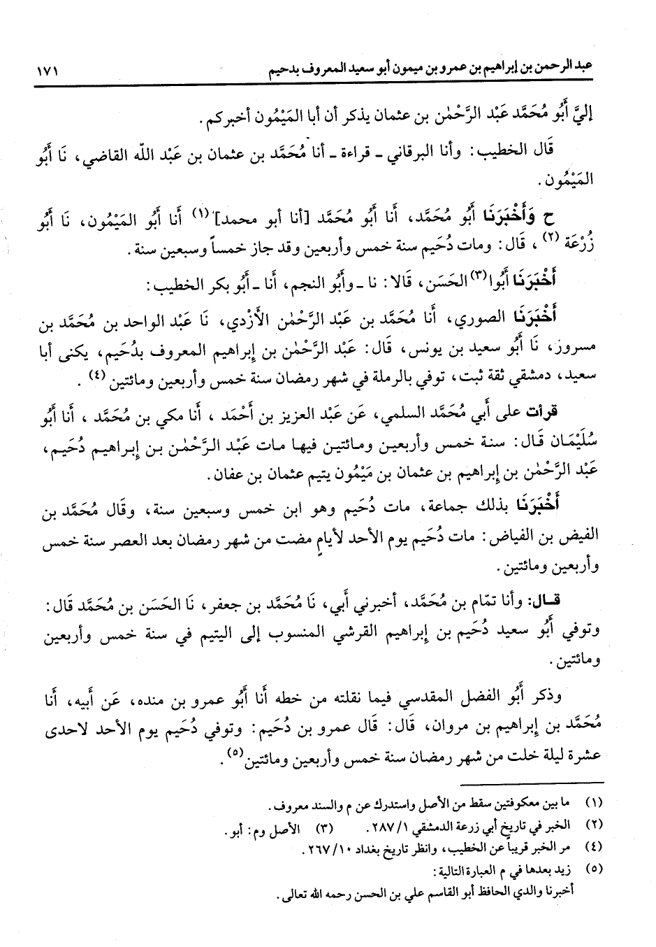 إلي أبو محمد عبد الرحمن بن عثمان يذكر أن أبا الميمون أخبركم قال الخطيب وأنا البرقاني قراءة أنا محمد بن عثمان بن عبد الله القاضي نا أبو الميمون ح وأخبرنا أبو محمد أنا أبو محمد أنا أبو محمد (1) أنا أبو الميمون نا أبو زرعة (2) قال ومات دحيم سنة خمس وأربعين وقد جاز خمسا وسبعين سنة أخبرنا أبوا (3) الحسن قالا نا وأبو النجم أنا أبو بكر الخطيب أخبرنا الصوري أنا محمد بن عبد الرحمن الأزدي نا عبد الواحد بن محمد بن مسرور نا أبو سعيد بن يونس قال عبد الرحمن بن إبراهيم المعروف بدحيم يكنى أبا سعيد دمشقي ثقة ثبت توفي بالرملة في شهر رمضان سنة خمس وأربعين ومائتين (4) قرأت على أبي محمد السلمي عن عبد العزيز بن أحمد أنا مكي بن محمد أنا أبو سليمان قال سنة خمس وأربعين ومائتين فيها مات عبد الرحمن بن إبراهيم دحيم عبد الرحمن بن إبراهيم بن عثمان بن ميمون يتيم عثمان بن عفان أخبرنا بذلك جماعة مات دحيم وهو ابن خمس وسبعين سنة وقال محمد بن الفيض بن الفياض مات دحيم يوم الأحد لأيام مضت من شهر رمضان بعد العصر سنة خمس وأربعين ومائتين قال وأنا تمام بن محمد أخبرني أبي نا محمد بن جعفر نا الحسن بن محمد قال وتوفي أبو سعيد دحيم بن إبراهيم القرشي المنسوب إلى اليتيم في سنة خمس وأربعين ومائتين وذكر أبو الفضل المقدسي فيما نقلته من خطة أنا أبو عمرو بن مندة عن أبيه أنا محمد بن إبراهيم بن مروان قال قال عمرو بن دحيم وتوفي دحيم يوم الأحد لإحدى عشرة ليلة خلت من شهر رمضان سنة خمس وأربعين ومائتين (5)