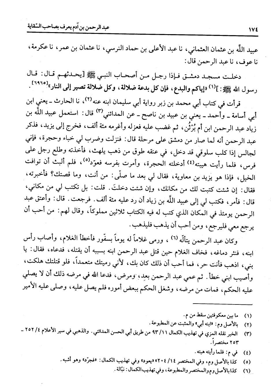عبيد الله بن عثمان العثماني نا عبد الأعلى بن حماد النرسي نا عثمان بن عمر نا عكرمة نا عوف نا عبد الرحمن قال دخلت مسجد دمشق فإذا رجل من أصحاب النبي (صلى الله عليه وسلم) يحدثهم قال قال رسول الله (صلى الله عليه وسلم) (1) إياكم والبدع فإن كل بدعة ضلالة وكل ضلالة تصير إلى النار