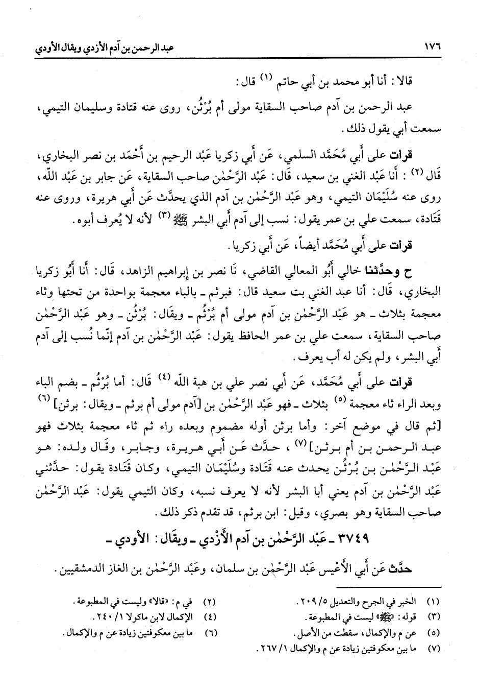 قالا أنا أبو محمد بن أبي حاتم (1) قال عبد الرحمن بن آدم صاحب السقاية مولى أم برثن روى عنه قتادة وسليمان التيمي سمعت أبي يقول ذلك قرأت على أبي محمد السلمي عن أبي زكريا عبد الرحيم بن احمد بن نصر البخاري قال (2) أنا عبد الغني بن سعيد قال عبد الرحمن صاحب السقاية عن جابر بن عبد الله روى عنه سليمان التيمي وهو عبد الرحمن بن آدم الذي يحدث عن أبي هريرة وروى عنه قتادة سمعت علي بن عمر يقول نسب إلى آدم أبي البشر (صلى الله عليه وسلم) (3) لأنه لا يعرف أبوه قرأت على أبي محمد أيضا عن أبي زكريا ح وحدثنا خالي أبو المعالي القاضي نا نصر بن إبراهيم الزاهد قال أنا أبو زكريا البخاري قال أنا عبد الغني بت سعيد قال فبرثم بالباء معجمة بواحدة من تحتها وثاء معجمة بثلاث هو عبد الرحمن بن آدم مولى أم برثم ويقال برثن وهو عبد الرحمن صاحب السقاية سمعت علي بن عمر الحافظ يقول عبد الرحمن بن آدم إنما نسب إلى آدم أبي البشر ولم يكن له أب يعرف قرأت على أبي محمد عن أبي نصر علي بن هبة الله (4) قال أما برثم بضم الباء وبعد الراء ثاء معجمة (5) بثلاث فهو عبد الرحمن بن آدم مولى أم برثم ويقال برثن (6) ثم قال في موضع آخر وأما برثن أوله مضموم وبعده راء ثم ثاء معجمة بثلاث فهو عبد الرحمن بن أم برثن (7) حدث عن أبي هريرة وجابر وقال ولده هو عبد الرحمن بن برثن يحدث عنه قتادة وسليمان التيمي وكان قتادة يقول حدثني عبد الرحمن بن آدم بعني أبا البشر لأنه لا يعرف نسبه وكان التيمي يقول عبد الرحمن صاحب السقاية وهو بصري وقيل ابن برثم قد تقدم ذكر ذلك