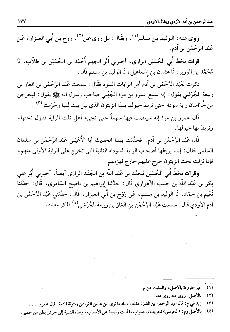 روى عنه الوليد بن مسلم (1) ويقال بل روى عن (2) روح بن أبي العيزار عن عبد الرحمن بن آدم قرأت بخط أبي الحسين الرازي أخبرني أبو الجهم أحمد بن الحسين بن طلاب نا محمد بن الوزير نا عثمان بن إسماعيل نا الوليد بن مسلم قال ذكرت لعبد الرحمن بن آدم أمر الرايات فقال سمعت عبد الرحمن بن الغار بن ربيعة الجرشي يقول إنه سمع عمرو بن مرة الجهني صاحب رسول الله (صلى الله عليه وسلم) يقول ليخرجن من خراسان راية سوداء حتى تربط خيولها بهذا الزيتون الذي بين بيت لهيا وحرستا (3) قال عمرو بن مرة إنه سينصب فيها سهما حتى تجئ أهل تلك الراية فتنزل تحتها وتربط بها خيولها قال عبد الرحمن بن آدم فحدث بهذا الحديث أبا الأعيس عبد الرحمن بن سلمان السلمي فقال إنما يربطها أصحاب الراية السوداء الثانية التي تخرج على الراية الأولى منهم فإذا نزلت تحت الزيتون خرج عليهم خارج فهزمهم وقرأت بخط أبي الحسين محمد بن عبد الله بن الجنيد الرازي أيضا أخبرني أبو علي بكر بن عبد الله بن حبيب الأهوازي قال حدثنا إبراهيم بن ناصح السامري قال حدثنا نعيم بن حماد نا الوليد بن مسلم عن روح بن أبي العيزار قال حدثني عبد الرحمن بن آدم الأودي قال سمعت عبد الرحمن بن الغاز بن ربيعة الجرشي (4) فذكر معناه