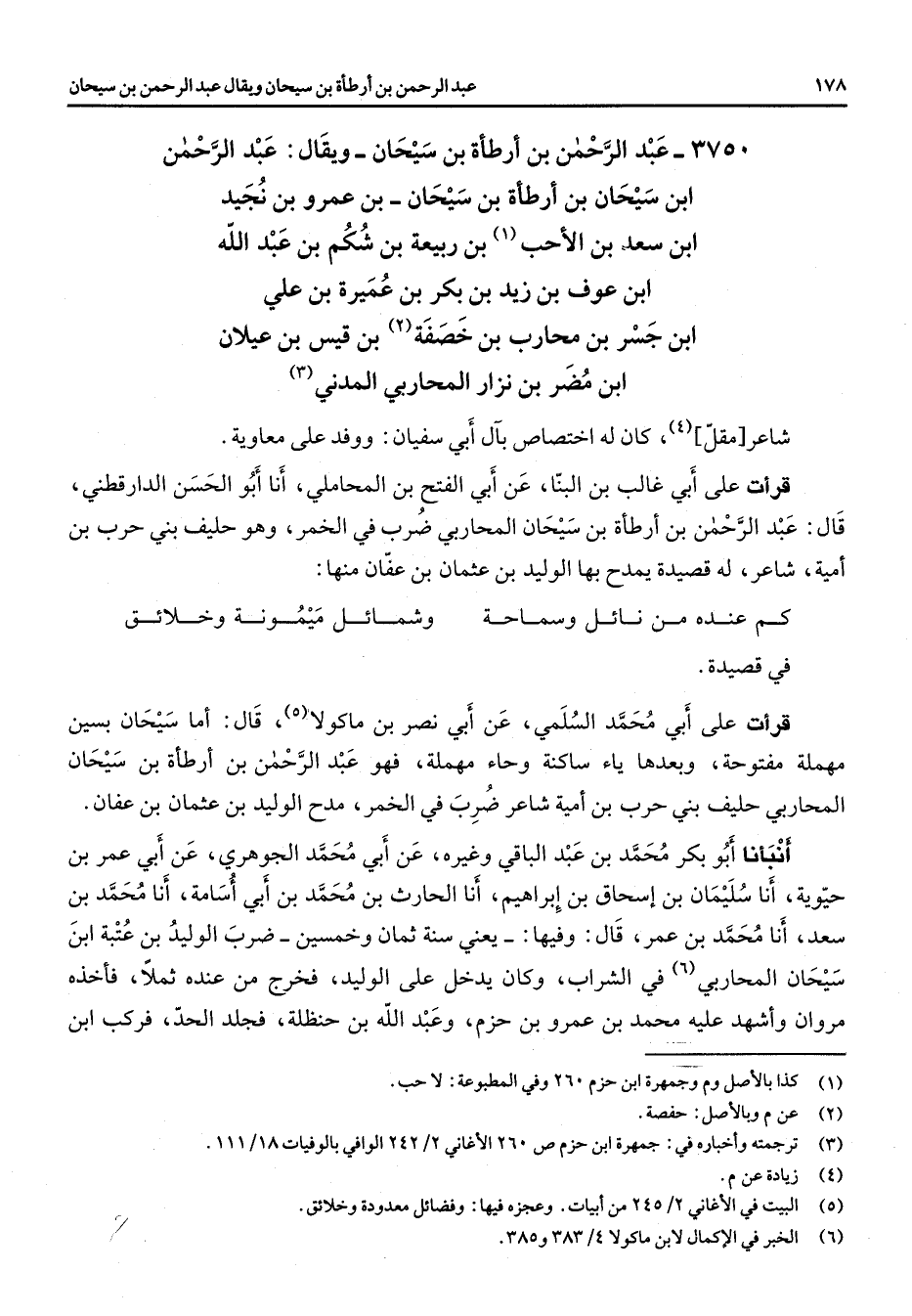 3750 - عبد الرحمن بن أرطأة بن سيحان ويقال عبد الرحمن ابن سيحان بن أرطأة بن سيحان بن عمرو بن نجيد ابن سعد بن الأحب (1) بن ربيعة بن شكم بن عبد الله ابن عوف بن زيد بن بكر بن عميرة بن علي ابن جسر بن محارب بن خصفة (2) بن قيس بن عيلان ابن مضر بن نزار المحاربي المدني (3) شاعر مقل (4) كان له اختصاص بآل سفيان ووفد على معاوية قرأت على أبي غالب بن البنا عن أبي الفتح بن المحاملي أنا أبو الحسن الدارقطني قال عبد الرحمن بن أرطأة بن سيحان المحاربي ضرب في الخمر وهو حليف بني حرب بن أمية شاعر له قصيدة يمدح بها الوليد بن عثمان بن عفان منها * كم عنده من نائل وسماحة * وشمائل ميمونة وخلائق * في قصيدة قرأت على أبي محمد السلمي عن أبي نصر بن ماكولا (5) قال أما سيحان بسين مهملة مفتوحة وبعدها ياء ساكنة وحاء مهملة فهو عبد الرحمن بن أرطأة بن سيحان المحاربي حليف بني حرب بن أمية شاعر ضرب في الخمر مدح الوليد بن عثمان بن عفان أنبأنا أبو بكر محمد بن عبد الباقي وغيره عن أبي محمد الجوهري عن أبي عمر بن حيوية أبو سليمان بن إسحاق بن إبراهيم أنا الحارث بن محمد بن أبي أسامة أنا محمد بن سعد أنا محمد بن عمر قال وفيها يعني سنة ثمان وخمسين ضرب الوليد بن عتبة ابن سيحان المحاربي (6) في الشراب وكان يدخل على الوليد فخرج من عنده ثملا فأخذه مروان وأشهد عليه محمد بن عمرو بن حزم وعبد الله بن حنظلة فجلد الحد فركب ابن