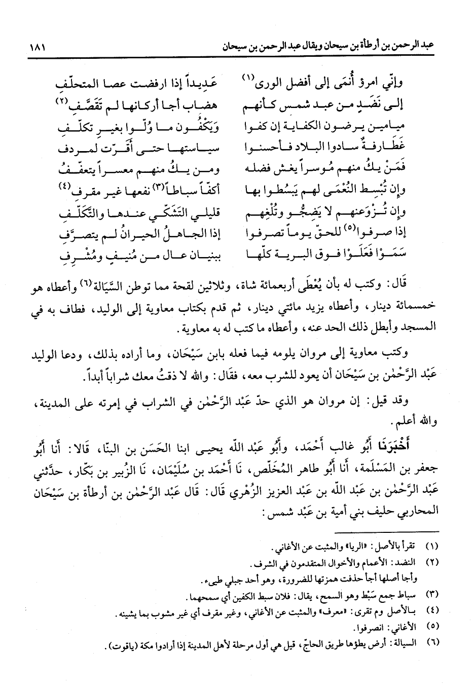 وإني امرؤ أنمى إلى أفضل الورى (1) * عديدا إذا رفضت عصا المتحلف إلى نضد من عبد شمس كأنهم * هضاب أجا أركانها لم تقصف (2) ميامين يرضون الكفاية إن كفوا * ويكفون ما ولوا بغير تكلف غطارفة سادوا البلاد فأحسنوا * سياستها حتى أقرت لمردف فمن يك منهم موسرا يغش فضله * ومن يك منهم معسرا يتعفف * * وإن تبسط النعمى لهم يبسطوا بها * أكفا سباطا (3) نفعها غير مقرف (4) * وإن تزوعنهم لا يضجو وتلغهم * قليلي التشكي عندها والتكلف إذا صرفوا (5) للحق يوما تصرفوا * إذا الجاهل الحيران لم يتصرف سموا فعلوا فوق البرية كلها * ببنيان عال من منيف ومشرف * قال وكتب له بأن يعطى أربعمائة شاة وثلاثين لقحة مما توطن السيالة (6) وأعطاه هو خمسمائة دينار وأعطاه يزيد مائتي دينار ثم قدم بكتاب معاوية إلى الوليد فطاف به في المسجد وأبطل ذلك الحد عنه وأعطاه ما كتب له به معاوية وكتب معاوية إلى مروان يلومه فيما فعله بابن سيحان وما أراده بذلك ودعا الوليد عبد الرحمن بن سيحان أن يعود للشرب معه فقال والله لا ذقت معك شرابا أبدا وقد قيل إن مروان هو الذي حد عبد الرحمن في الشراب في إمرته على المدينة والله أعلم أخبرنا أبو غالب أحمد وأبو عبد الله يحيى ابنا الحسن بن البنا قالا أنا أبو جعفر بن المسلمة أنا أبو طاهر المخلص نا أحمد بن سليمان نا الزبير بن بكار حدثني عبد الرحمن بن عبد الله بن عبد العزيز الزهري قال قال عبد الرحمن بن أرطأة بن سيحان المحاربي حليف بني أمية بن عبد شمس *