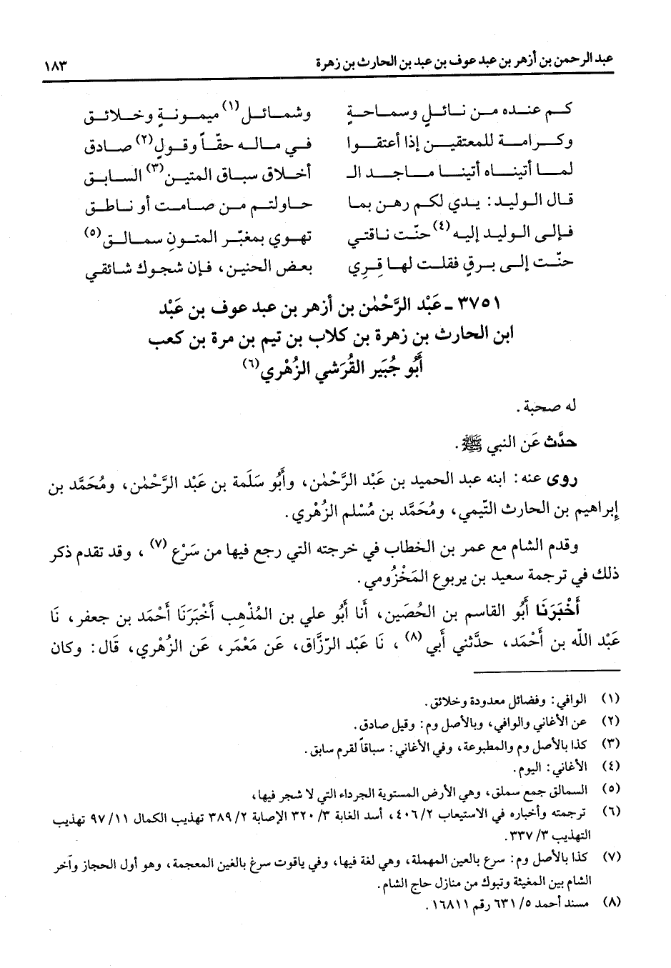 3751 - عبد الرحمن بن أزهر بن عبد عوف بن عبد ابن الحارث بن زهرة بن كلاب بن تيم بن مرة بن كعب أبو جبير القرشي الزهري (6) له صحبة حدث عن النبي (صلى الله عليه وسلم) روى عنه ابنه عبد الحميد بن عبد الرحمن وأبو سلمة بن عبد الرحمن ومحمد بن إبراهيم بن الحارث التيمي ومحمد بن مسلم الزهري وقدم الشام مع عمر بن الخطاب في خرجته التي رجع فيها من سرع (7) وقد تقدم ذكر ذلك في رجمة سعيد بن يربوع المخزومي أخبرنا أبو القاسم بن الحصين أنا أبو علي بن المذهب أخبرنا أحمد بن جعفر نا عبد الله بن أحمد حدثني أبي (8) نا عبد الرزاق عن معمر عن الزهري قال وكان