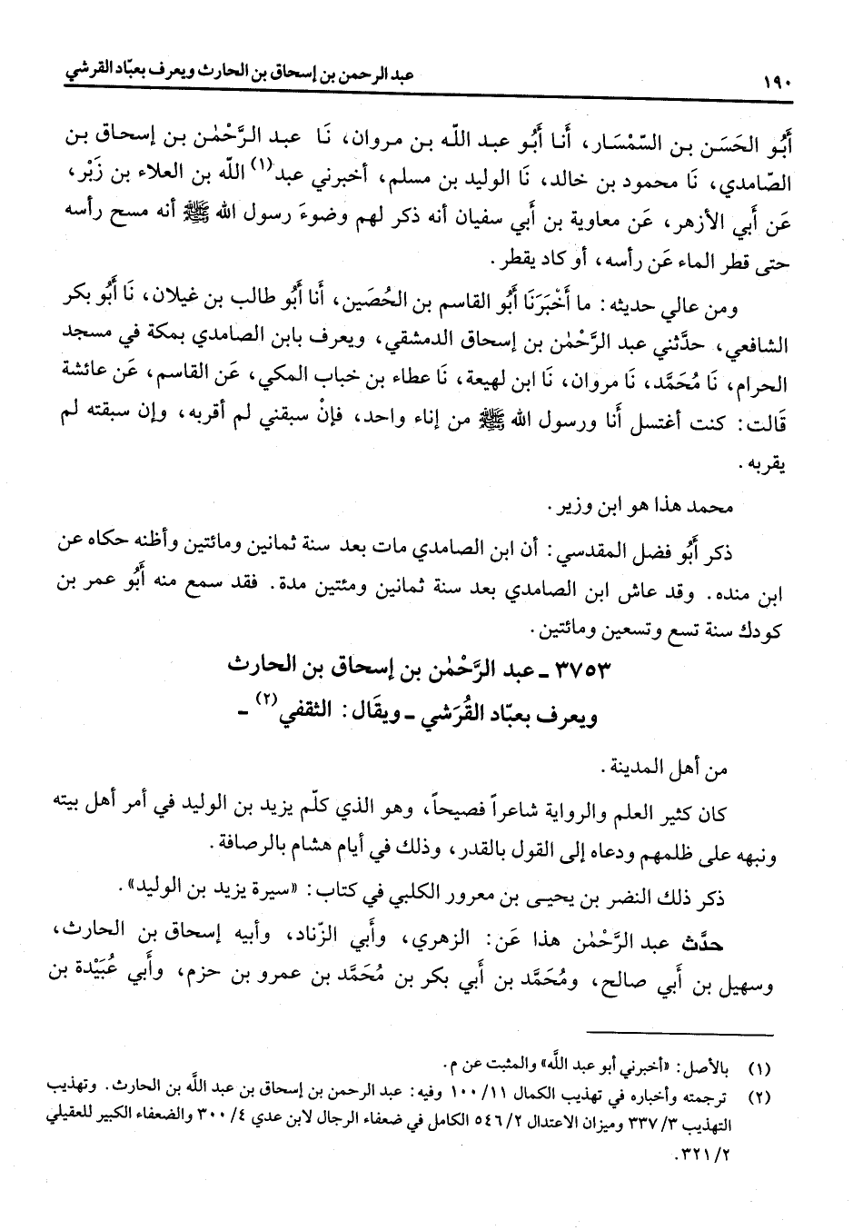 3753 - عبد الرحمن بن أسحاق بن الحارث ويعرف بعباد القرشي ويقال الثقفي (2) من أهل المدينة كان كثير العلم والرواية شاعرا فصيحا وهو الذي كلم يزيد بن الوليد في أمر أهل بيته ونبهه على ظلمهم ودعاه إلى القول بالقدر وذلك في أيام هشام بالرصافة ذكر ذلك النضر بن يحيى بن معرور الكلبي في كتاب سيرة يزيد بن الوليد حدث عبد الرحمن هذا عن الزهري وأبي الزناد وأبيه إسحاق بن الحارث وسهيل بن أبي صالح ومحمد بن أبي بكر بن محمد بن عمرو بن حزم وأبي عبيدة بن