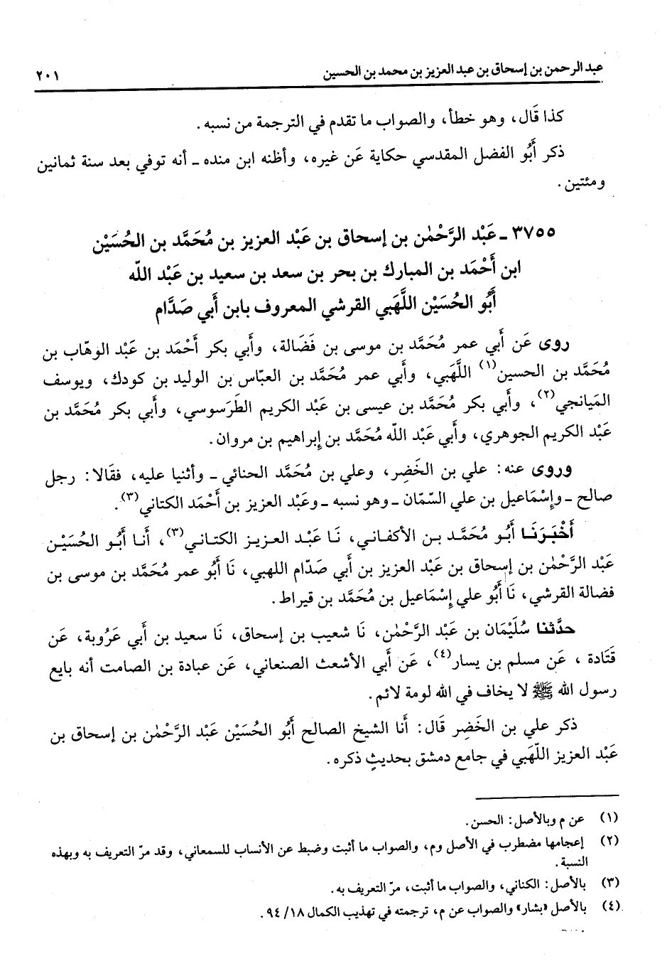 3755 - عبد الرحمن بن إسحاق بن عبد العزيز بن محمد بن الحسين ابن أحمد بن المبارك بن بحر بن سعد بن سعيد بن عبد الله أبو الحسين اللهبي القرشي المعروف باب أبي صدام روى عن أبي عمر محمد بن موسى بن فضالة وأبي بكر أحمد بن عبد الوهاب بن محمد بن الحسين (1) اللهبي وأبي عمر محمد بن العباس بن الوليد بن كودك ويوسف الميانجي (2) وأبي بكر محمد بن عيسى بن عبد الكريم الطرسوسي وأبي بكر محمد بن عبد الكريم الجوهري وأبي عبد الله محمد بن إبراهيم بن مروان وروى عنه علي بن الخضر وعلي بن محمد الحنائي وأثنيا عليه فقالا رجل صالح وإسماعيل بن علي السمان وهو نسبه وعبد العزيز بن أحمد الكتاني (3) أخبرنا أبو محمد بن الأكفاني نا عبد العزيز الكتاني (3) أنا أبو الحسين عبد الرحمن بن إسحاق بن عبد العزيز بن أبي صدام اللهبي نا أبو عمر محمد بن موسى بن فضالة القرشي نا أبو علي إسماعيل بن محمد بن قيراط حدثنا سليمان بن عبد الرحمن نا شعيب بن إسحاق نا سعيد بن أبي عروبة عن قتادة عن مسلم بن يسار (4) عن أبي الأشعث الصنعاني عن عبادة بن الصامت أنه بايع رسول الله (صلى الله عليه وسلم) لا يخاف في الله لومة لائم ذكر علي بن الخضر قال أنا الشيخ الصالح أبو الحسين عبد الرحمن بن إسحاق بن عبد العزيز اللهبي في جامع دمشق بحديث ذكره