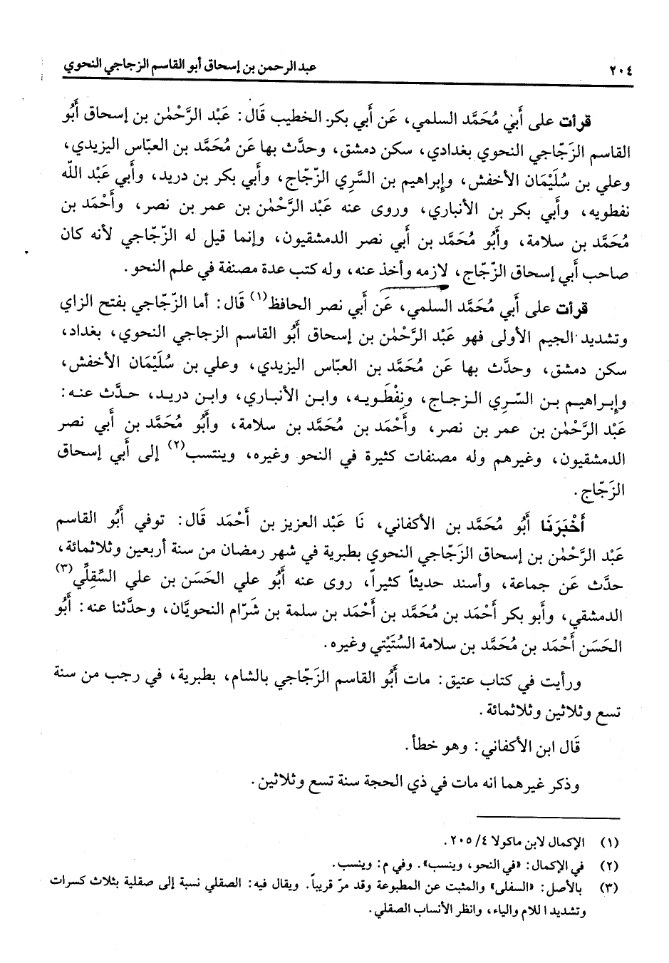 قرأت على أبي محمد السلمي عن أبي بكر الخطيب قال عبد الرحمن بن إسحاق أبو بكر القاسم الزجاجي النحوي بغدادي سكن دمشق وحدث بها عن محمد بن العباس اليزيدي وعلي بن سليمان الأخفش وإبراهيم بن السري الزجاج وأبي بكر بن دريد وأبي عبد الله نفطوية وأبي بكر بن الأنباري وروى عنه عبد الرحمن بن عمر بن نصر وأحمد بن محمد بن سلامة وأبو محمد بن أبي نصر الدمشقيون وإنما قيل له الزجاجي لأنه كان صاحب أبي إسحاق الزجاج لازمه وأخذ عنه وله كتب عدة مصنفة في علم النحو قرأت على أبي محمد السلمي عن أبي نصر الحافظ (1) قال أما الزجاجي بفتح الزاي وتشديد الجيم الأولى فهو عبد الرحمن بن إسحاق أبو القاسم الزجاجي النحوي بغداد سكن دمشق وحدث بها عن محمد بن العباس اليزيدي وعلي بن سليمان الأخفش وإبراهيم بن السري الزجاج ونفطوية وابن الأنباري وابن دريد حدث عنه عبد الرحمن بن عمر بن نصر وأحمد بن محمد بن سلامة وأبو محمد بن أبي نصر الدمشقيون وغيرهم وله مصنفات كثيرة في النحو وغيره وينتسب (2) إلى أبي إسحاق الزجاج أخبرنا أبو محمد بن الأكفاني نا عبد العزيز بن أحمد قال توفي أبو القاسم عبد الرحمن بن إسحاق الزجاجي النحوي بطبرية في شهر رمضان من سنة أربعين وثلاثمائة حدث عن جماعة وأسند حديثا كثيرا روى عنه أبو علي الحسن بن علي السقلي (3) الدمشقي وأبو بكر أحمد بن محمد بن أحمد بن سلمة بن شرام النحويان وحدثنا عنه أبو الحسن أحمد بن محمد بن سلامة الستيتي وغيره ورأيت في كتاب عتيق مات أبو القاسم الزجاجي بالشام بطبرية في رجب من سنة تسع وثلاثين وثلاثمائة قال ابن الأكفاني وهو خطأ وذكر غيرهما أنه مات في ذي الحجة سنة تسع وثلاثين