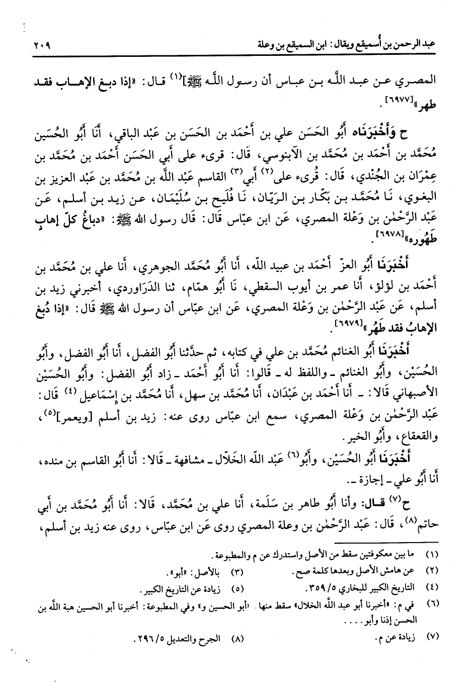 [6977] ح وأخبرناه أبو الحسن علي بن أحمد بن الحسن بن عبد الباقي أنا أبو الحسين محمد بن أحمد بن محمد بن الآبنوسي قال قرئ على أبي الحسن أحمد بن محمد بن عمران بن الجندي قال قرئ على (2) أبي (3) القاسم عبد الله بن محمد بن عبد العزيز بن البغوي نا محمد بن بكار بن الريان نا فليح بن سليمان عن زيد بن أسلم عن عبد الرحمن بن وعلة المصري عن ابن عباس قال قال رسول الله (صلى الله عليه وسلم) دباغ كل إهاب طهوره