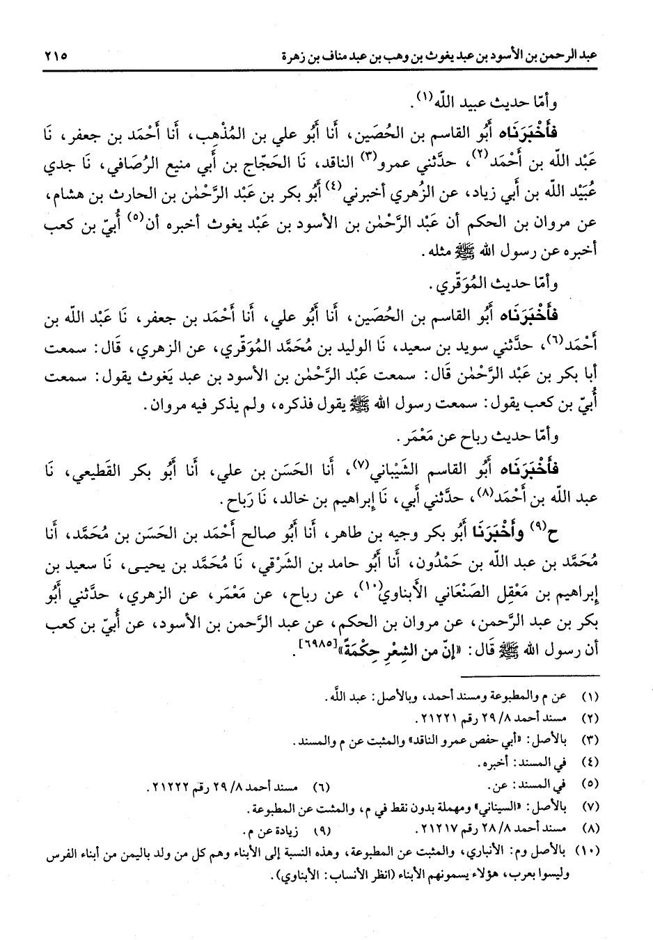وأما حديث عبيد الله (1) فأخبرناه أبو القاسم بن الحصين أنا أبو علي بن المذهب أنا أحمد بن جعفر نا عبد الله بن أحمد (2) حدثني عمرو (3) الناقد نا الحجاج بن أبي منيع الرصافي نا جدي عبيد الله بن أبي زياد عن الزهري أخبرني (4) أبو بكر بن عبد الرحمن بن الحارث بن هشام عن مروان بن الحكم أن عبد الرحمن بن الأسود بن عبد يغوث أخبره أن (5) أبي بن كعب أخبره عن رسول الله (صلى الله عليه وسلم) مثله وأما حديث الموقري فأخبرناه أبوس القاسم بن الحصين أنا أبو علي أنا أحمد بن جعفر نا عبد الله بن أحمد (6) حدثني سويد بن سعيد نا الوليد بن محمد الموقري عن الزهري قال سمعت أبا بكر بن عبد الرحمن قال سمعت عبد الرحمن بن الأسود بن عبد يغوث يقول سمعت أبي بن كعب يقول سمعت رسول الله (صلى الله عليه وسلم) يقول فذكره ولم يذكر فيه مروان وأما حديث رباح عن معمر فأخبرناه أبو القاسم الشيباني (7) أنا الحسن بن علي أنا أبو بكر القطيعي نا عبد الله بن أحمد (8) حدثني أبي نا إبراهيم بن خالد نا رباح ح (9) وأخبرنا أبو بكر وجيه بن طاهر أنا أبو صالح أحمد بن الحسن بن محمد أنا محمد بن عبد الله بن حمدون أنا أبو حامد بن الشرقي نا محمد بن يحيى نا سعيد بن إبراهيم بن معقل الصنعاني الأبناوي (10) عن رباح عن معمر عن الزهري حدثني أبو بكر بن عبد الرحمن عن مروان بن الحكم عن عبد الرحمن بن الأسود عن أبي بن كعب أن رسول الله (صلى الله عليه وسلم) قال إن من الشعر حكمة