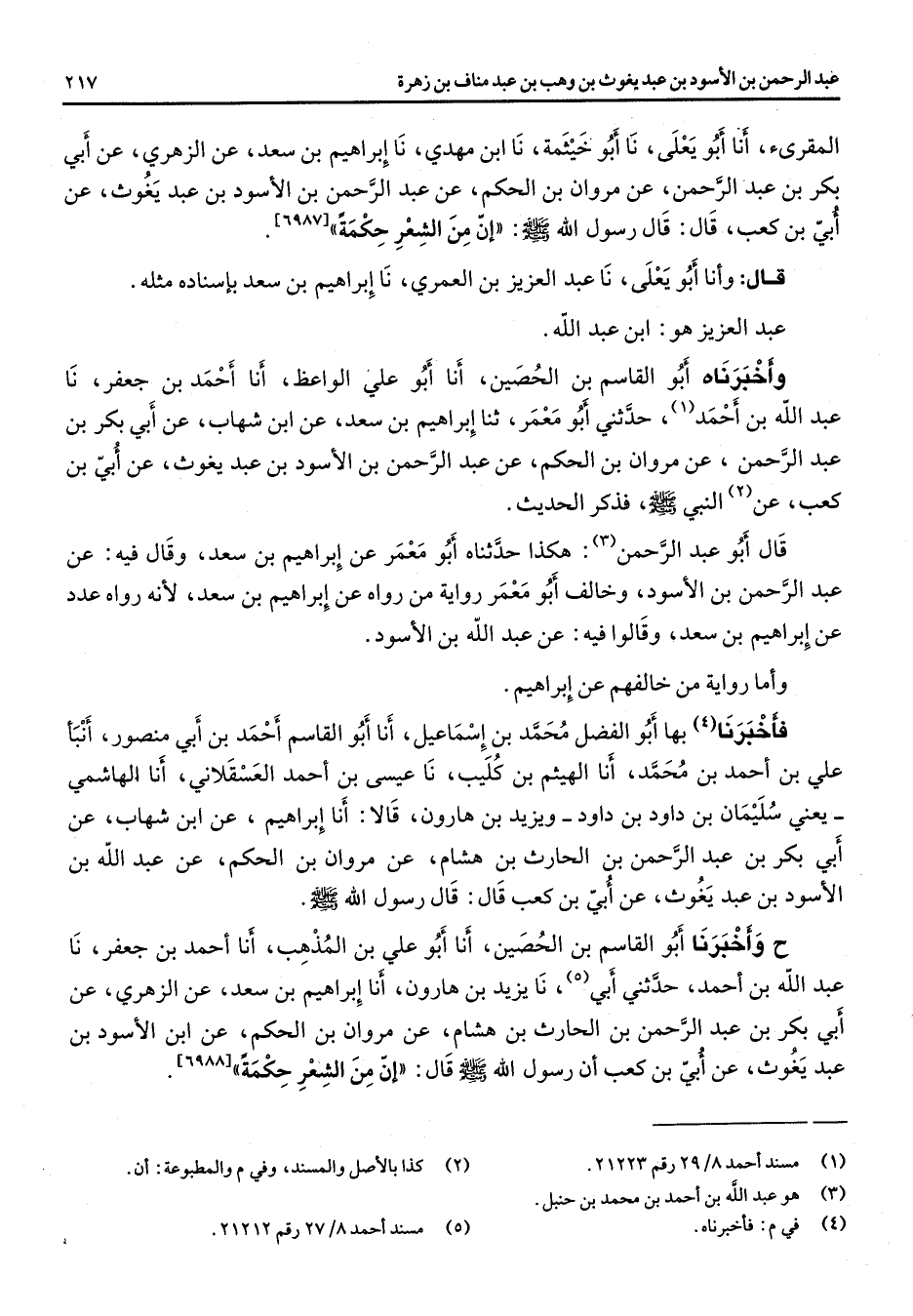 [6987] قال قال وأنا أبو يعلى نا عبد العزيز بن العمري نا إبراهيم بن سعد بإسناده مثله عبد العزيز هو ابن عبد الله وأخبرناه أبو القاسم بن الحصين أنا أبو علي الواعظ أنا أحمد بن جعفر نا عبد الله بن أحمد (1) حدثني أبو معمر ثنا إبراهيم بن سعد عن ابن شهاب عن أبي بكر بن عبد الرحمن عن مروان بن الحكم عن عبد الرحمن بن الأسود بن عبد يغوث عن أبي بن كعب عن (2) النبي (صلى الله عليه وسلم) فذكر الحديث قال أبو عبد الرحمن (3) هكذا حدثناه أبو معمر عن إبراهيم بن سعد وقال فيه عن عبد الرحمن بن الأسود وخالف أبو معمر رواية من رواه عن إبراهيم بن سعد لأنه رواه عدد عن إبراهيم بن سعد وقالوا فيه عن عبد الله بن الأسود وأما رواية من خالفهم عن إبراهيم فأخبرنا (4) بها أبو الفضل محمد بن إسماعيل أنا أبو القاسم أحمد بن أبي منصور أنبأ علي بن أحمد بن محمد أنا الهيثم بن كليب نا عيسى بن أحمد العسقلاني أنا الهاشمي يعني سليمان بن داود بن داود ويزيد بن هارون قالا أنا إبراهيم عن ابن شهاب عن أبي بكر بن عبد الرحمن بن الحارث بن هشام عن مروان بن الحكم عن عبد الله بن الأسود بن يغوث عن أبي بن كعب قال قال رسول الله (صلى الله عليه وسلم) ح وأخبرنا أبو القاسم بن الحصين أنا أبو علي بن المذهب أنا أحمد بن جعفر نا عبد الله بن أحمد حدثني أبي (5) نا يزيد بن هارون أنا إبراهيم بن سعد عن الزهري عن أبي بكر بن عبد الرحمن بن الحارث بن هشام عن مروان بن الحكم عن ابن الأسود بن عبد يغوث عن أبي بن كعب أن رسول الله (صلى الله عليه وسلم) قال إن من الشعر حكمة