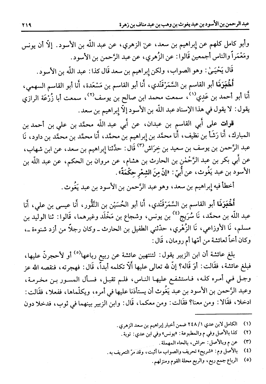 وأبو كامل كلهم عن إبراهيم بن سعد عن الزهري عن عبد الله بن الأسود إلا أن يونس ومعمرا والناس أجمعين قالوا عن الزهري عن عبد الرحمن بن الأسود قال يحيى وهو الصواب ولكن إبراهيم بن سعد قال كذا عبد الله بن الأسود أخبرنا أبو القاسم بن السمرقندي أنا أبو القاسم بن مسعدة أنا أبو القاسم السهمي أنا أبو أحمد بن عدي (1) سمعت محمد ابن صالح بن يوسف (2) سمعت أبا زرعة الرازي يقول لا يقول في هذا الإسناد عبد الله بن الأسود إلا إبراهيم بن سعد قرأت على أبي القاسم بن عبدان عن أبي عبد الله محمد بن علي بن أحمد بن المبارك أنا رشأ بن نظيف أنا محمد بن إبراهيم بن محمد أنا محمد بن محمد بن داود نا عبد الرحمن بن يوسف بن سعيد بن خراش (3) قال حدثنا إبراهيم بن سعد عن ابن شهاب عن أبي بكر بن عبد الرحمن بن الحارث بن هشام عن مروان بن الحكم عن عبد الله بن الأسود بن عبد يغوث عن أبي إن من الشعر حكمة أخطأ فيه إبراهيم بن سعد وهو عبد الرحمن بن الأسود بن عبد يغوث أخبرنا أبو القاسم بن السمرقندي أنا أبو الحسين بن النقور أنا عيسى بن علي أنا عبد الله بن محمد نا سريج (4) بن يونس وشجاع بن مخلد وغيرهما قالوا ثنا الوليد بن مسلم نا الأوزاعي نا الزهري حدثني الطفيل بن الحارث وكان رجلا من أزد شنوءة وكان أخا لعائشة من أمها أم رومان قال بلغ عائشة أن ابن الزبير يقول لتنتهين عائشة عن ربيع رباعها (5) أو لأحجرن عليها فبلغ عائشة فقالت أو قاله إن لله تعالى عليها ألا تكلمه أبدا قال فهجرته فنقصه الله عز وجل في أمره كله فاستشفع عليها الناس فلم تقبل فسأل المسور بن مخرمة وعبد الرحمن بن الأسود بن عبد يغوث أن يستأذنا عليها في أمره ويكلماها ففعلا فقالت ادخلا فقالا ومن معنا فقالت ومن معكما قال وابن الزبير بينهما في ثوب فدخلا دون
