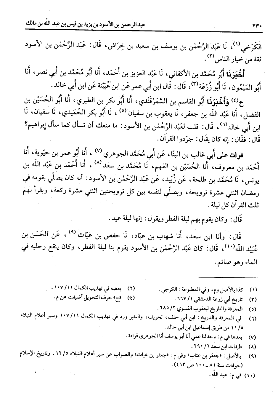 الكرخي (1) أنا عبد الرحمن بن يوسف بن سعيد بن خراش قال عبد الرحمن بن الأسود ثقة من خيار الناس (2) أخبرنا أبو محمد بن الأكفاني نا عبد العزيز بن أحمد أنا أبو محمد بن أبي نصر أنا أبو الميمون نا أبو زرعة (3) قال قال ابن أبي عمر عن ابن عيينة عن ابن أبي خالد ح (4) وأخبرنا أبو القاسم بن السمرقندي أنا أبو بكر بن الطبري أنا أبو الحسين بن الفضل أنا عبد الله بن جعفر نا يعقوب بن سفيان (5) نا أبو بكر الحميدي نا سفيان نا ابن أبي خالد (6) قال قلت لعبد الرحمن بن الأسود ما منعك أن تسأل كما سأل إبراهيم قال فقال إنه كان يقال جردوا القرآن قرأت على أبي غالب بن البنا عن أبي محمد الجوهري (7) أنا أبو عمر بن حيوية أنا أحمد بن معروف أنا الحسين بن الفهم نا محمد بن سعد (8) أنا أحمد بن عبد الله بن يونس نا محمد بن طلحة عن زبيد عن عبد الرحمن بن الأسود أنه كان يصلي بقومه في رمضان اثنتي عشرة ترويحة ويصلي لنفسه بين كل ترويحتين اثنتي عشرة ركعة ويقرأ بهم ثلث القرآن كل ليلة قال وكان يقول بهم ليلة الفطر ويقول إنها ليلة عيد قال وأنا ابن سعد أنا شهاب بن عباد نا حفص بن غياث (9) عن الحسن بن عبيد الله (10) قال كان عبد الرحمن بن الأسود يقوم بنا ليلة الفطر وكان ينقع رجليه في الماء وهو صائم