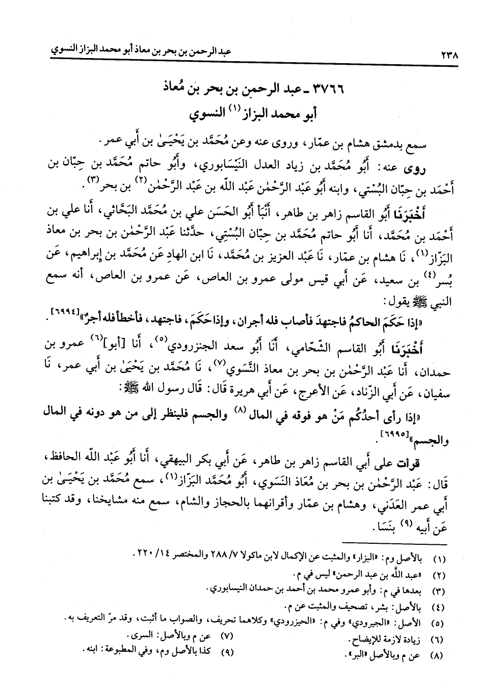 3766 - عبد الرحمن بن بحر بن معاذ أبو محمد البزاز (1) النسوي سمع بدمشق هشام بن عمار وروى عنه وعن محمد بن يحيى بن أبي عمر روى عنه أبو محمد بن زياد العدل النيسابوري وأبو حاتم محمد بن حبان بن أحمد بن حبان البستي وابنه أبو عبد الرحمن (2) عبد الله بن عبد الرحمن بن بحر (3) أخبرنا أبو القاسم زاهر بن طاهر أنبأ أبو الحسن علي بن محمد البحاثي أنا علي بن أحمد بن محمد أنا أبو حاتم محمد بن حبان البستي حدثنا عبد الرحمن بن بحر بن معاذ البزاز (1) نا هشام بن عمار نا عبد العزيز بن محمد نا ابن الهاد عن محمد بن إبراهيم عن بسر (4) بن سعيد عن أبي قيس مولى عمرو بن العاص عن عمرو بن العاص أنه سمع النبي (صلى الله عليه وسلم) يقول إذا حكم الحاكم فاجتهد فأصاب فله أجران وإذا حكم فاجتهد فأخطأ فله أجر