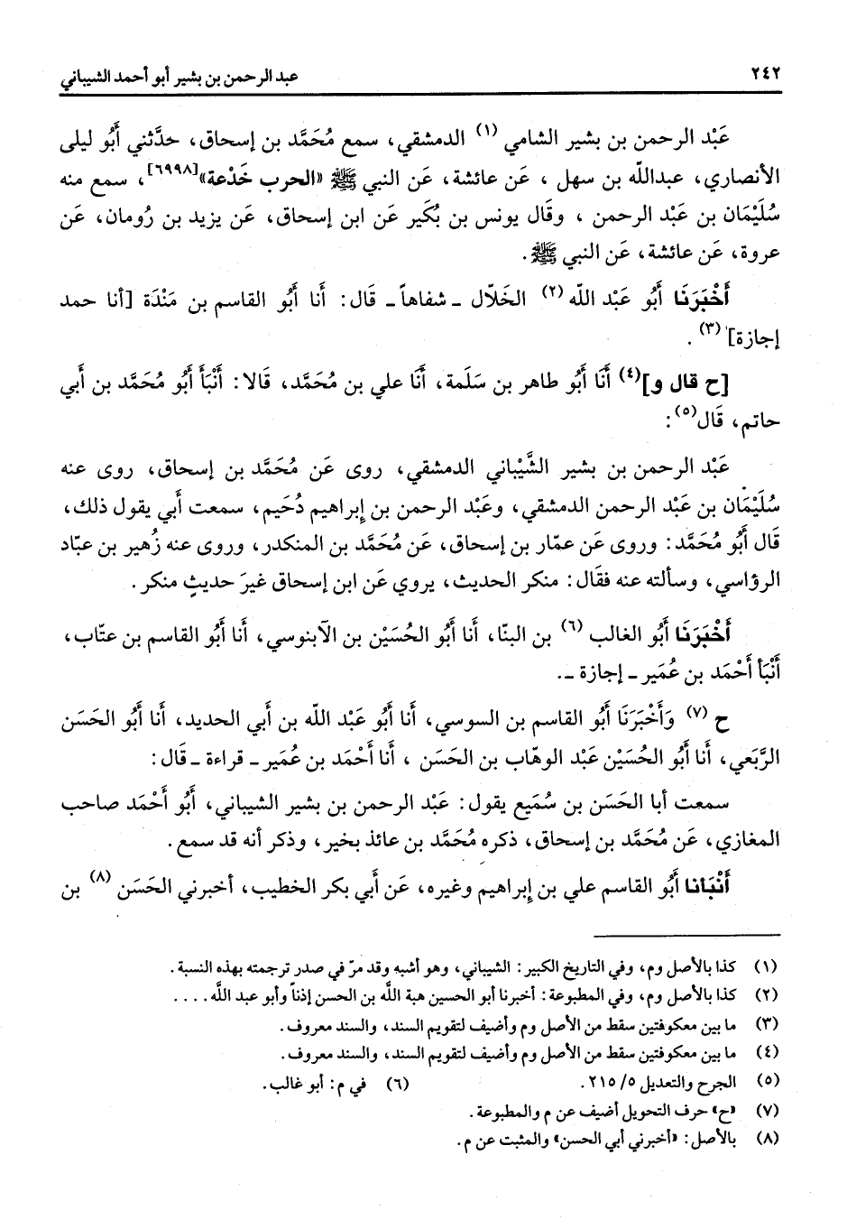 [6998] سمع منه سليمان بن عبد الرحمن وقال يونس بن بكير عن ابن إسحاق عن يزيد بن رومان عن عروة عن عائشة عن النبي (صلى الله عليه وسلم) أخبرنا أبو عبد الله (2) الخلال شفاها قال أنا أبو القاسم بن مندة أنا أحمد إجازة (3) ح قال و (4) أنا أبو طاهر بن سلمة أنا علي بن محمد قالا أنبأ أبو محمد بن أبي حاتم قال (5) عبد الرحمن بن بشير الشيباني الدمشقي روى عن محمد بن إسحاق روى عنه سليمان بن عبد الرحمن الدمشقي وعبد الرحمن بن إبراهيم دحيم سمعت أبي يقول ذلك قال أبو محمد وروى عن عمار بن إسحاق عن محمد بن المنكدر وروى عنه زهير بن عباد الرؤاسي وسألته عنه فقال منكر الحديث يروي عن ابن إسحاق غير حديث منكر أخبرنا أبو الغالب (6) بن البنا أنا أبو الحسين بن الآبنوسي أنا أبو القاسم بن عتاب أنبأ أحمد بن عمير إجازة ح (7) وأخبرنا أبو القاسم بن السوسي أنا أبو عبد الله بن أبي الحديد أنا أبو الحسن الربعي أنا أبو الحسين عبد الوهاب بن الحسن أنا أحمد بن عمير قراءة قال سمعت أبا الحسن بن سميع يقول عبد الرحمن بن بشير الشيباني أبو أحمد صاحب المغازي عن محمد بن إسحاق ذكره محمد بن عائذ بخير وذكر أنه قد سمع أنبأنا أبو القاسم علي بن إبراهيم وغيره عن أبي بكر الخطيب أخبرني الحسن (8) بن