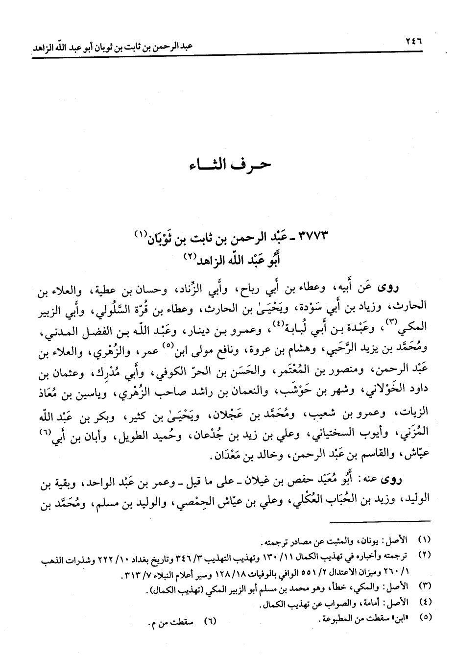 3773 - عبد الرحمن بن ثابت بن ثوبان (1) أبو عبد الله الزاهد (2) روى عن أبيه وعطاء بن أبي رباح وأبي الزناد وحسان بن عطية والعلاء بن الحارث وزياد بن أبي سودة ويحيى بن الحارث وعطاء بن قرة السلولي وأبي الزبير المكي (3) وعبدة بن أبي لبابة (4) وعمرو بن دينار وعبد الله بن الفضل المدني ومحمد بن يزيد الرحبي وهشام بن عروة ونافع مولى ابن (5) عمر والزهري والعلاء بن عبد الرحمن ومنصور بن المعتمر والحسن بن الحر الكوفي وأبي مدرك وعثمان بن داود الخولاني وشهر بن حوشب والنعمان بن راشد صاحب الزهري وياسين بن معاذ الزيات وعمرو بن شعيب ومحمد بن عجلان ويحيى بن كثير وبكر بن عبد الله المزني وأيوب السختياني وعلي بن زيد بن جدعان وحميد الطويل وأبان بن أبي (6) عياش والقاسم بن عبد الرحمن وخالد بن معدان روى عنه أبو معيد حفص بن غيلان على ما قيل وعمر بن عبد الواحد وبقية بن الوليد وزيد بن الحباب العكلي وعلي بن عياش الحمصي والوليد بن مسلم ومحمد بن