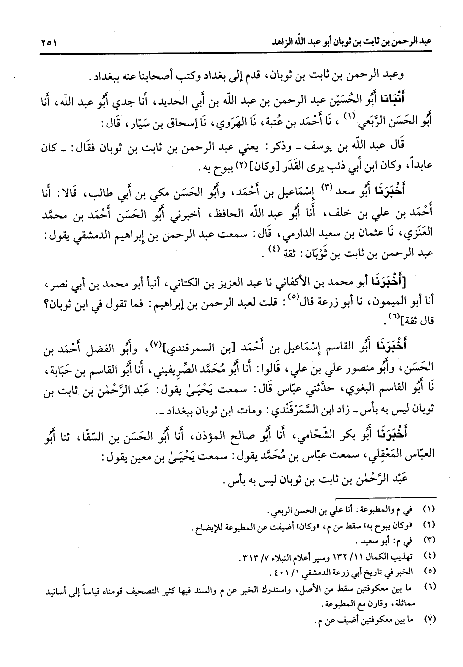 وعبد الرحمن بن ثابت بن ثوبان قدم إلى بغداد وكتب أصحابنا عنه ببغداد أنبأنا أبو الحسين عبد الرحمن بن عبد الله بن أبي الحديد أنا جدي أبو عبد الله أنا أبو الحسن الربعي (1) نا أحمد بن عتبة نا الهروي نا إسحاق بن سيار قال قال عبد الله بن يوسف وذكر يعني عبد الرحمن بن ثابت بن ثوبان فقال كان عابدا وكان ابن أبي ذئب يرى القدر وكان (2) يبوح به أخبرنا أبو سعد (3) إسماعيل بن أحمد وأبو الحسن مكي بن أبي طالب قالا أنا أحمد بن علي بن خلف أنا أبو عبد الله الحافظ أخبرني أبو الحسن أحمد بن محمد العنزي نا عثمان بن سعيد الدارمي قال سمعت عبد الرحمن بن إبراهيم الدمشقي يقول عبد الرحمن بن ثابت بن ثوبان ثقة (4) أخبرنا أبو محمد بن الأكفاني نا عبد العزيز بن الكتاني أنبأ أبو محمد بن أبي نصر أنا أبو الميمون نا أبو زرعة قال (5) قلت لعبد الرحمن بن إبراهيم فما تقول في ابن ثوبان قال ثقة (6) أخبرنا أبو القاسم إسماعيل بن أحمد بن السمرقندي (7) وأبو الفضل أحمد بن الحسن وأبو منصور علي بن علي قالوا أنا أبو محمد الصريفيني أنا أبو القاسم بن حبابة نا أبو القاسم البغوي حدثني عباس قال سمعت يحيى يقول عبد الرحمن بن ثابت بن ثوبان ليس به بأس زاد ابن السمرقندي ومات ابن ثوبان ببغداد أخبرنا أبو بكر الشحامي أنا أبو صالح المؤذن أنا أبو الحسن بن السقا ثنا أبو العباس المعقلي سمعت عباس بن محمد يقول سمعت يحيى بن معين يقول عبد الرحمن بن ثابت بن ثوبان ليس به بأس