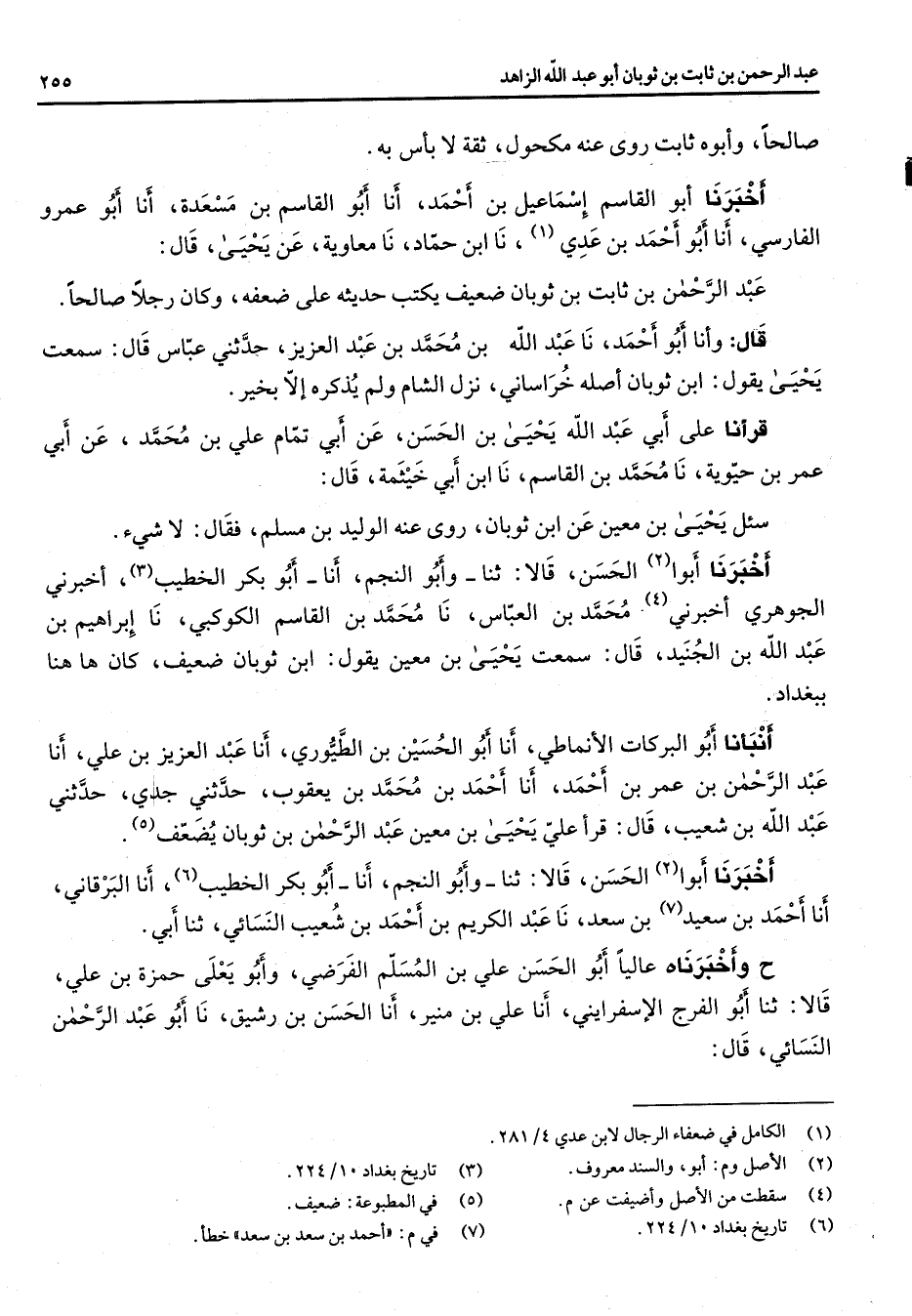 صالحا وأبوه ثابت روى عنه مكحول ثقة لا بأس به أخبرنا أبو القاسم إسماعيل بن أحمد أنا أبو القاسم بن مسعدة أنا أبو عمرو الفارسي أنا أبو أحمد بن عدي (1) نا ابن حماد نا معاوية عن يحيى قال عبد الرحمن بن ثابت بن ثوبان ضعيف يكتب حديثه على ضعفه وكان رجلا صالحا قال وأنا أبو أحمد نا عبد الله بن محمد بن عبد العزيز حدثني عباس قال سمعت يحيى يقول ابن ثوبان أصله خراساني نزل الشام ولم يذكره إلا بخير قرأنا على أبي عبد الله يحيى بن الحسن عن أبي تمام علي بن محمد عن أبي عمر بن حيوية نا محمد بن القاسم نا ابن أبي خيثمة قال سئل يحيى بن معين عن ابن ثوبان روى عنه الوليد بن مسلم فقال لا شئ أخبرنا أبوا (2) الحسن قالا ثنا وأبو النجم أنا أبو بكر الخطيب (3) أخبرني الجوهري أخبرني (4) محمد بن العباس نا محمد بن القاسم الكوكبي نا إبراهيم بن عبد الله بن الجنيد قال سمعت يحيى بن معين يقول ابن ثوبان ضعيف كان ها هنا ببغداد أنبأنا أبو البركات الأنماطي أنا أبو الحسين بن الطيوري أنا عبد العزيز بن علي أنا عبد الرحمن بن عمر بن أحمد أنا أحمد بن محمد بن يعقوب حدثني جدي حدثني عبد الله بن شعيب قال قرأ علي يحيى بن معين عبد الرحمن بن ثوبان يضعف (5) أخبرنا أبوا (2) الحسن قالا ثنا وأبو النجم أنا أبو بكر الخطيب (6) أنا البرقاني أنا أحمد بن سعيد (7) بن سعد نا عبد الكريم بن أحمد بن شعيب النسائي ثنا أبي ح وأخبرناه عاليا أبو الحسن علي بن المسلم الفرضي وأبو يعلى حمزة بن علي قالا ثنا أبو الفرج الإسفرايني أنا علي بن منير أنا الحسن بن رشيق نا أبو عبد الرحمن النسائي قال