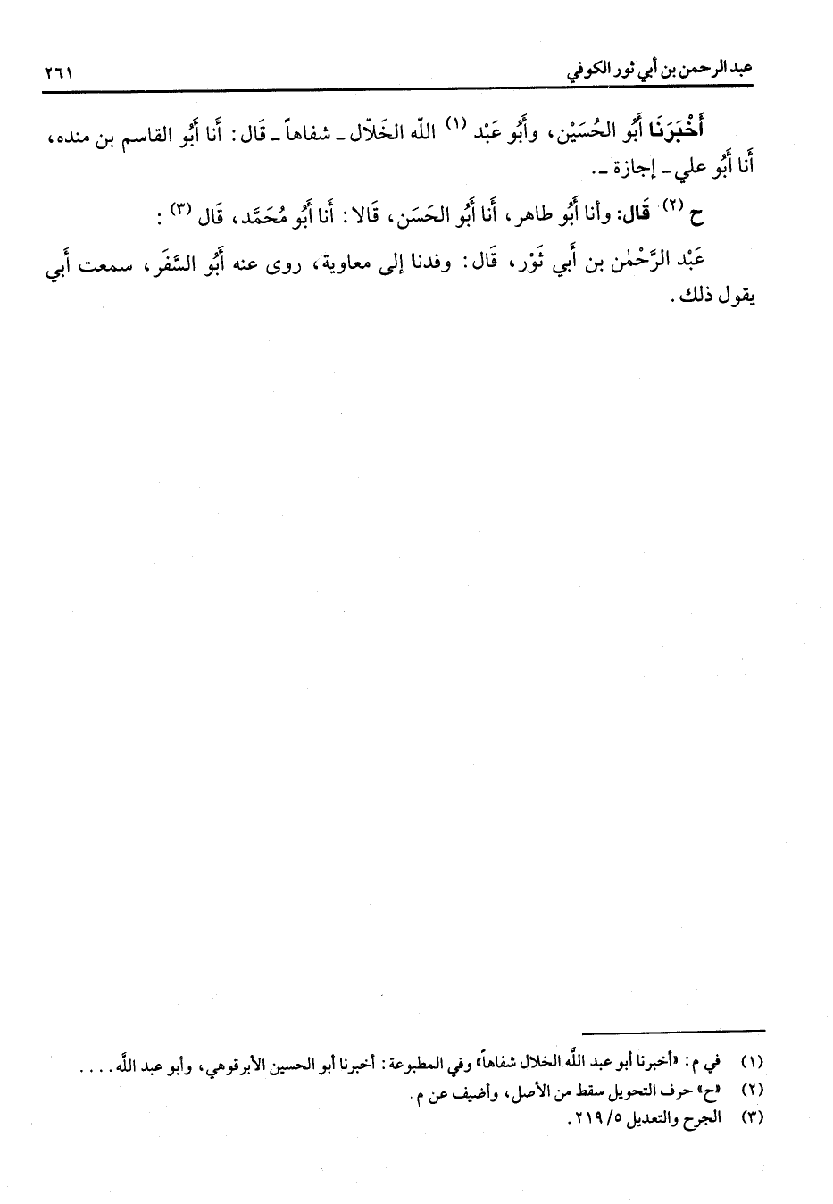 أخبرنا أبو الحسين وأبو عبد (1) الله الخلال شفاها قال أنا أبو القاسم بن مندة أنا أبو علي إجازة ح (2) قال وأنا أبو طاهر أنا أبو الحسن قالا أنا أبو محمد قال (3) عبد الرحمن بن أبي ثور قال وفدنا إلى معاوية روى عنه أبو السفر سمعت أبي يقول ذلك "