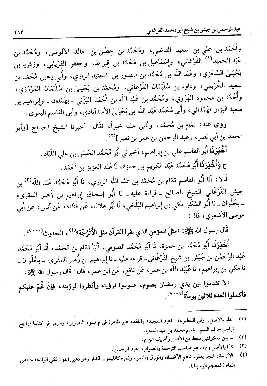أخبرنا أبو محمد بن حمزة نا أبو محمد الصوفي أنبأ تمام بن محمد أنا أبو محمد عبد الرحمن بن جيش بن شيخ الفرغاني قراءة عليه نا إبراهيم بن زهير المقرئ بحلوان نا مكي بن إبراهيم نا عبيد الله بن عمر عن نافع عن ابن عمر قال قال رسول الله (صلى الله عليه وسلم) لا تقدموا بين يدي رمضان بصوم صوموا لرؤيته وأفطروا لرؤيته فإن غم عليكم فأكملوا العدة ثلاثين يوما