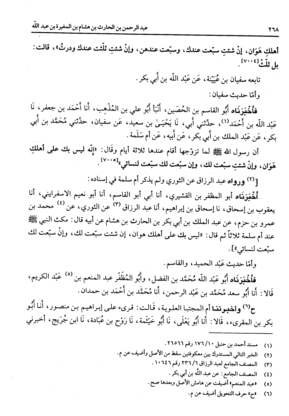 [7005] (2) ورواه عبد الرزاق عن الثوري ولم يذكر أم سلمة في إسناده أخبرناه أبو المظفر بن القشيري أنا أبي أبو القاسم أنا أبو نعيم الإسفرايني أنا يعقوب بن إسحاق نا إسحاق بن إبراهيم أنا عبد الرزاق (3) عن الثوري عن (4) محمد بن عمرو بن حزم عن عبد الملك بن أبي بكر بن الحارث بن هشام عن أبيه قال مكث النبي (صلى الله عليه وسلم) عند أم سلمة ثلاثا ثم قال ليس بك على أهلك هوان إن شئت سبعت لك وإن سبعت لك سبعت لنسائي وأما حديث عبد الحميد والقاسم فأخبرناه أبو عبد الله محمد بن الفضل وأبو المظفر عبد المنعم بن (5) عبد الكريم قالا أنا أبو سعد محمد بن عبد الرحمن أنا محمد بن أحمد بن حمدان ح (6) وأخبرتنا أم المجتبا العلوية قالت قرئ على إبراهيم بن منصور أنا أبو بكر بن المقرئ قالا أنا أبو يعلى نا أبو خيثمة نا روح بن عبادة نا ابن جريج أخبرني