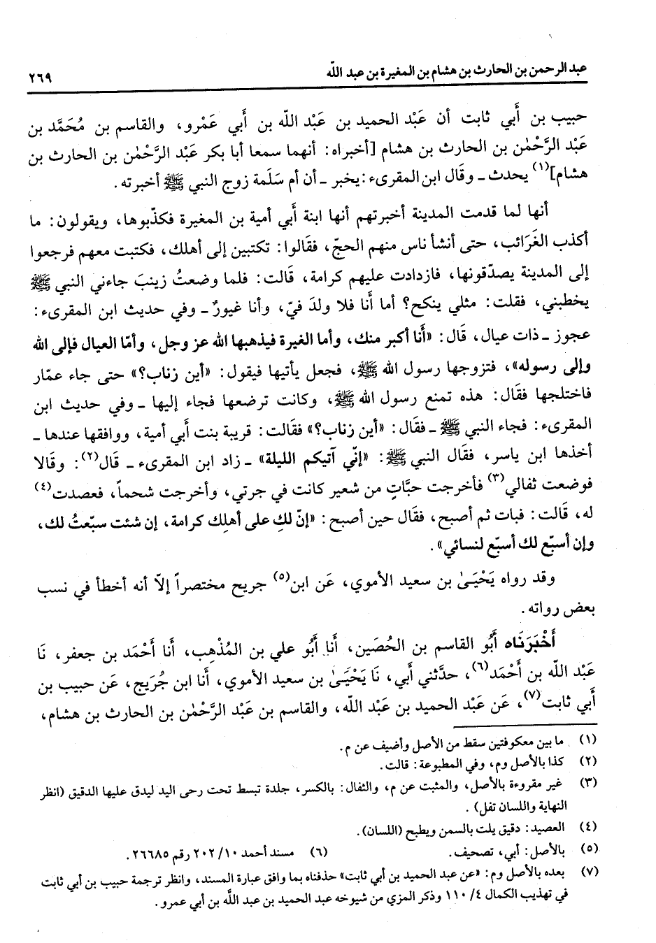 حبيب بن أبي ثابت أن عبد الحميد بن عبد الله بن أبي عمرو والقاسم بن محمد بن عبد الرحمن بن الحارث بن هشام أخبراه أنهما سمعا أبا بكر عبد الرحمن بن الحارث بن هشام (1) يحدث وقال ابن المقرئ يخبر أن أم سلمة زوج النبي (صلى الله عليه وسلم) أخبرته أنها لما قدمت المدينة أخبرتهم أنها ابنة أبي أمية بن المغيرة فكذبوها ويقولون ما أكذب الغرائب حتى أنشأ ناس منهم الحج فقالوا تكتبين إلى أهلك فكتبت معهم فرجعوا إلى المدينة يصدقونها فازدادت عليهم كرامة قالت فلما وضعت زينب جاءني النبي (صلى الله عليه وسلم) يخطبني فقلت مثلي ينكح أما أنا فلا ولد في وأنا غيور وفي حديث ابن المقرئ عجوز ذات عيال قال أنا أكبر منك وأما الغيرة فيذهبها الله عز وجل وأما العيال فإلى الله وإلى رسوله فتزوجها رسول الله (صلى الله عليه وسلم) فجعل يأتيها فيقول أين زناب حتى جاء عمار فاختلجها فقال هذه تمنع رسول الله (صلى الله عليه وسلم) وكانت ترضعها فجاء إليها وفي حديث ابن المقرئ فجاء النبي (صلى الله عليه وسلم) فقال أين زناب فقالت قريبة بنت أبي أمية ووافقها عندها أخذها ابن ياسر فقال النبي (صلى الله عليه وسلم) إني آتيكم الليلة زاد ابن المقرئ قال (2) وقالا فوضعت ثفالي (3) فأخرجت حبات من شعير كانت في جرتي وأخرجت شحما فعصدت (4) له قالت فبات ثم أصبح فقال حين أصبح إن لك على أهلك كرامة إن شئت سبعت لك وإن أسبع لك أسبع لنسائي وقد رواه يحيى بن سعيد الأموي عن ابن (5) جريح مختصرا إلا أنه أخطأ في نسب بعض رواته أخبرناه أبو القاسم بن الحصين أنا أبو علي بن المذهب أنا أحمد بن جعفر نا عبد الله بن أحمد (6) حدثني أبي نا يحيى بن سعيد الأموي أنا ابن جريج عن حبيب بن أبي ثابت (7) عن عبد الحميد بن عبد الله والقاسم بن عبد الرحمن بن الحارث بن هشام