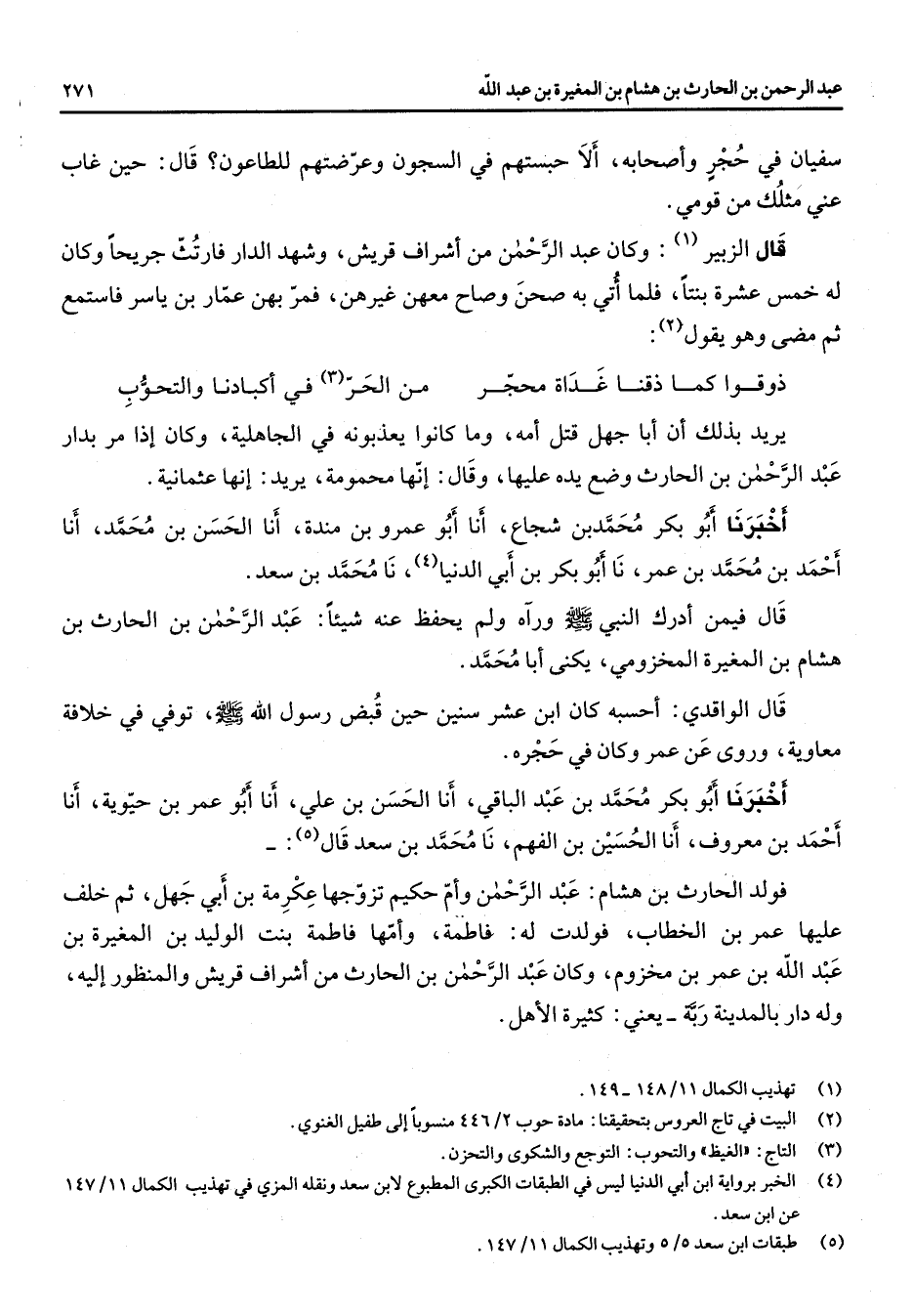 سفيان في حجر وأصحابه ألا حبستهم في السجون وعرضتهم للطاعون قال حين غاب عني مثلك من قومي قال الزبير (1) وكان عبد الرحمن من أشراف قريش وشهد الدار فارتث جريحا وكان له خمس عشرة بنتا فلما أتي به صحن وصاح معهن غيرهن فمر بهن عمار بن ياسر فاستمع ثم مضى وهو يقول * (2) ذوقوا كما ذقنا غداة محجر * من الحر (3) في أكبادنا والتحوب * يريد بذلك أن أبا جهل قتل أمه وما كانوا يعذبونه في الجاهلية وكان إذا مر بدار عبد الرحمن بن الحارث وضع يده عليها وقال إنها محمومة يريد إنها عثمانية أخبرنا أبو بكر محمد بن شجاع أنا أبو عمرو بن مندة أنا الحسن بن محمد أنا أحمد بن محمد بن عمر نا أبو بكر بن أبي الدنيا (4) نا محمد بن سعد قال فيمن أدرك النبي (صلى الله عليه وسلم) ورآه ولم يحفظ عنه شيئا عبد الرحمن بن الحارث بن هشام بن المغيرة المخزومي يكنى أبا محمد قال الواقدي أحسبه كان ابن عشر سنين حين قبض رسول الله (صلى الله عليه وسلم) توفي في خلافة معاوية وروى عن عمر وكان في حجره أخبرنا أبو بكر محمد بن عبد الباقي أنا الحسن بن علي أنا أبو عمر بن حيوية أنا أحمد بن معروف أنا الحسين بن الفهم نا محمد بن سعد قال (5) فولد الحارث بن هشام عبد الرحمن وأم حكيم تزوجها عكرمة بن أبي جهل ثم خلف عليها عمر بن الخطاب فولدت له فاطمة وأمها فاطمة بنت الوليد بن المغيرة بن عبد الله بن عمر بن مخزوم وكان عبد الرحمن بن الحارث من أشراف قريش والمنظور إليه وله دار بالمدينة ربة يعني كثيرة الأهل